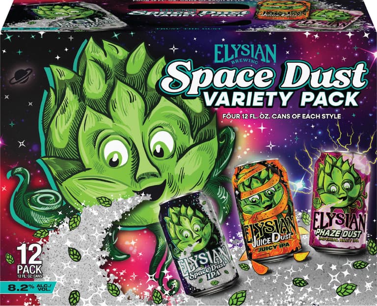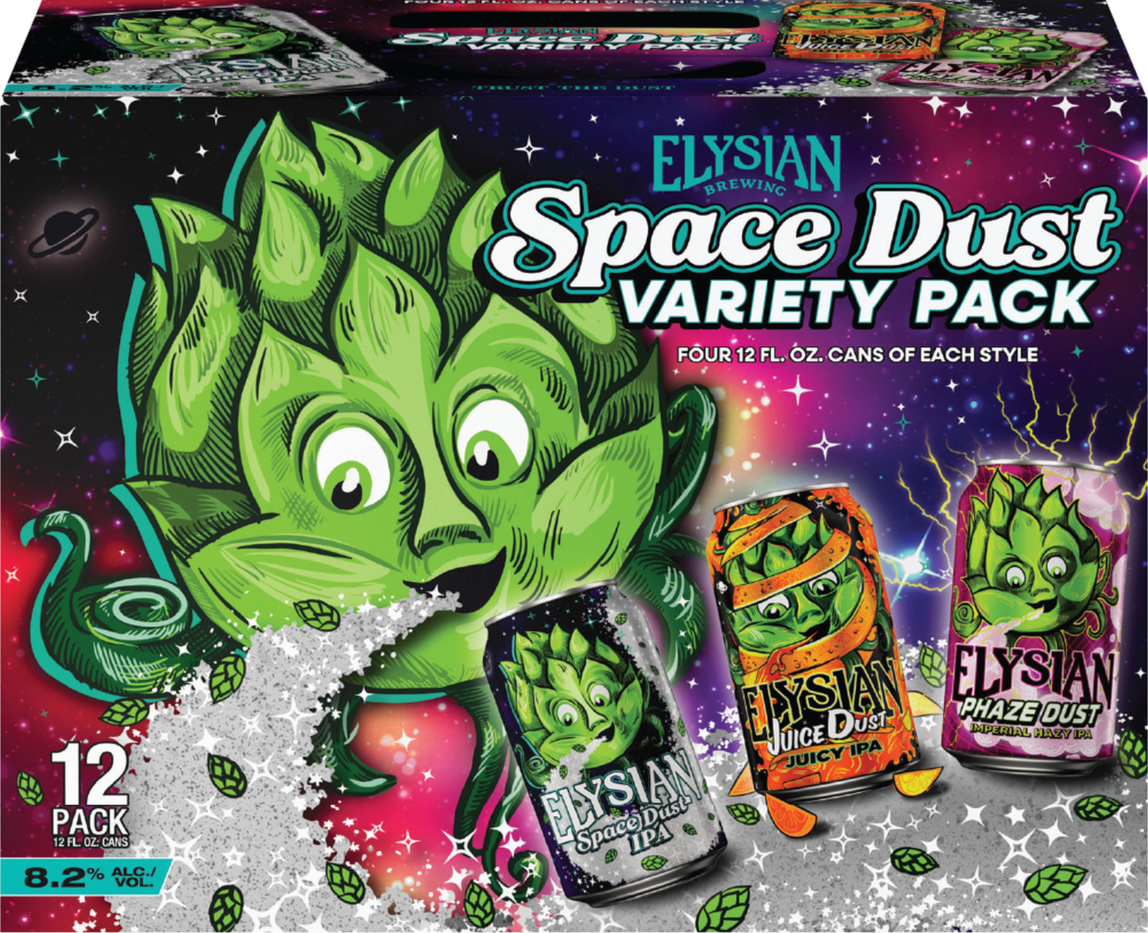 ELYSIAN VARIETY PACK IS THE PERFECT PARTY PACK WITH SOMETHING FOR EVERYONE.THIS VARIETY PACK INCLUDES 4 CANS OF THE SPACE DUST IPA 4 CANS OF THE JUICE DUST IPA AND 4 CANS OF THE PHAZE DUST IPA. SPACE DUST IPA IS A BOLD MISCHIEVOUSLY DRINKABLE IPA THAT BALANCES THE HOP SWEETNESS OF CANDIED GRAPEFRUIT MANGO AND PINE WITH A MEDIUM BODY AND DRY FINISH. JUICE DUST IPA IS POWERED BY VIBRANT BURSTS OF REAL ORANGE JUICE THAT CORKSCREWS THROUGH SPACE ON WAVES OF CITRUS AND NOTES OF SWEET TROPICAL FRUIT. PHAZE DUST IPA IS EMERGING FROM AN ELECTROFYING WORMHOLE OF FLAVOR. THIS HAZY IPA BILLOWS WITH A SOFT MOUTHFEEL AND SWEET NOTES OF CANDIED PEACH MANGO AND TANGERINE.Specifications