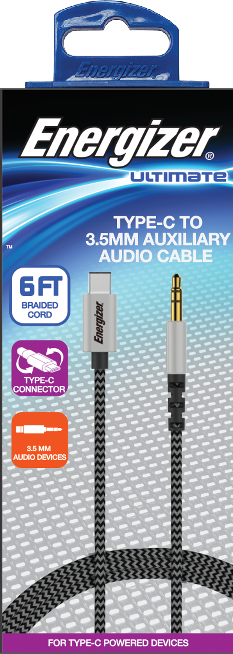 Introducing the Energizer 6ft Braided Type-C to 3.5mm Aux Cable, the perfect solution for connecting your Type-C devices to audio devices with a standard 3.5mm auxiliary input. Experience high-quality sound transmission and convenient compatibility with this durable and versatile cable.Designed to provide a seamless audio connection, this cable allows you to enjoy your favorite music, podcasts, and more on any device with a 3.5mm audio jack. Simply plug one end into your Type-C device, and the other into your headphones, speakers, or car stereo, and immerse yourself in a world of rich and immersive sound.The 6-foot length offers flexibility and convenience, allowing you to comfortably use your device while keeping it connected to your audio system. Whether you're relaxing at home, working in the office, or on the move, this cable provides the freedom to enjoy your audio content without restrictions.Crafted with a braided exterior, this cable is built to withstand daily use and resist tangles, ensuring a long-lasting and hassle-free experience. Its durable construction guarantees reliable performance, making it an ideal choice for music enthusiasts and audio professionals alike.Specifications