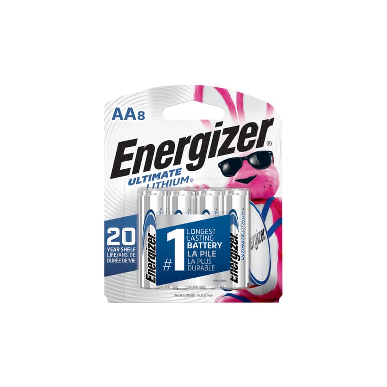 Nothing outlasts the long-lasting power of Energizer Ultimate Lithium Batteries. Each batterys safety-conscious, leak-proof design gives you confidence that your most-loved devices are protected against leaks and corrosion. These batteries can perform in extreme temperatures from -40F to 140F and last in storage for up to 20 years--making Ultimate Lithium batteries the clear choice to dependably power the essential devices in your life. Battery Type: Lithium Battery Size: AA For Use With: All High-Drain Devices Battery Capacity: 1700 mAh. AA Battery, AA, High Performance, Capacity - Batteries 3,400 mAh, Standard Battery Series Ultimate Lithium, Battery Chemistry Lithium, Voltage - Batteries 1.5V DC, Standard Battery Pack Size 8, Max. Operating Temp. 140 Degrees F, Min. Operating Temp. -40 Degrees F, Shelf Life 20 yr, Standards ANSI 15-LF, IEC-FR6, Diameter 0.55 in, Height 1.92 in, Overall Height 1.96 in, Package Quantity 8.Specifications