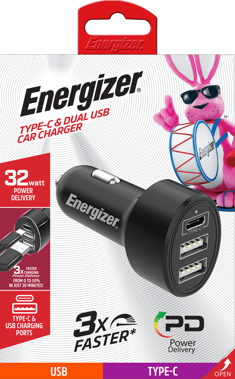Introducing the Energizer 32W PD & Dual USB Car Charger, the perfect companion for charging your devices on the go. Designed with efficiency and versatility in mind, this car charger combines Power Delivery (PD) technology with dual USB ports, providing fast and simultaneous charging for multiple devices.With its powerful 32W output, this car charger delivers rapid charging speeds, ensuring your devices are ready for use in no time. Whether it's your smartphone, tablet, or other USB-enabled devices, you can trust the Energizer Car Charger to provide a reliable and efficient charging experience.Equipped with Power Delivery (PD) technology, this charger offers optimized charging for compatible devices, allowing for faster charging times compared to standard chargers. You can conveniently charge your PD-compatible devices at their maximum supported speeds, saving you valuable time.The inclusion of dual USB ports allows you to charge two devices simultaneously, making it perfect for road trips, carpooling, or when you need to share charging with a passenger. The intelligent circuitry ensures safe and efficient charging for all connected devices.Designed with a sleek and compact form, this car charger seamlessly integrates into your vehicle's interior. Its durable construction ensures long-lasting performance even in the harshest conditions, making it an ideal companion for your everyday travels.Specifications