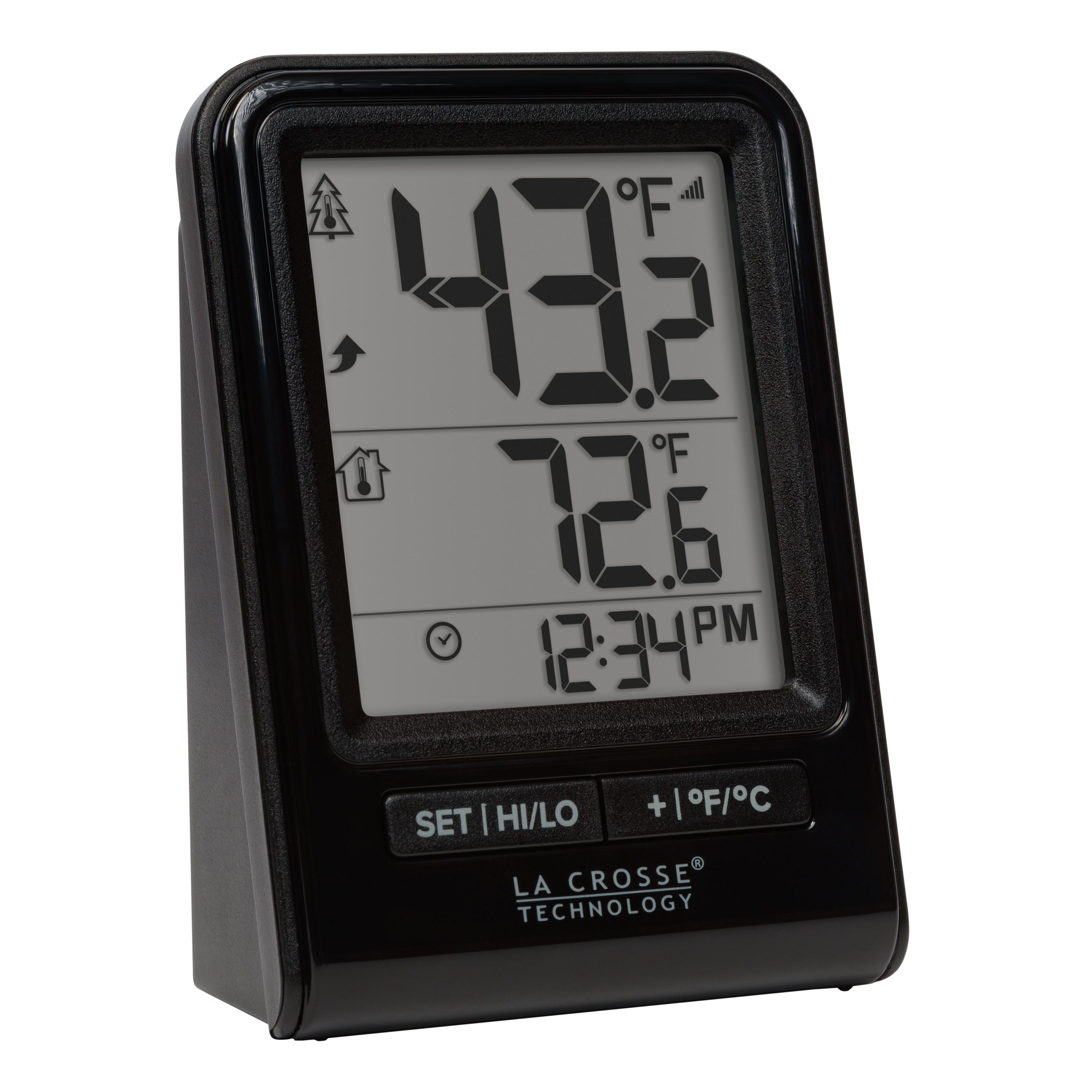 12/24-hour time display; 24 hour High/Low temperature records; Decimal display: On/Off option; Freestanding; Indoor/outdoor temperature (°F/°C); Low battery indicator: Display & Sensor; Signal strength indicator; Temperature trend indicators