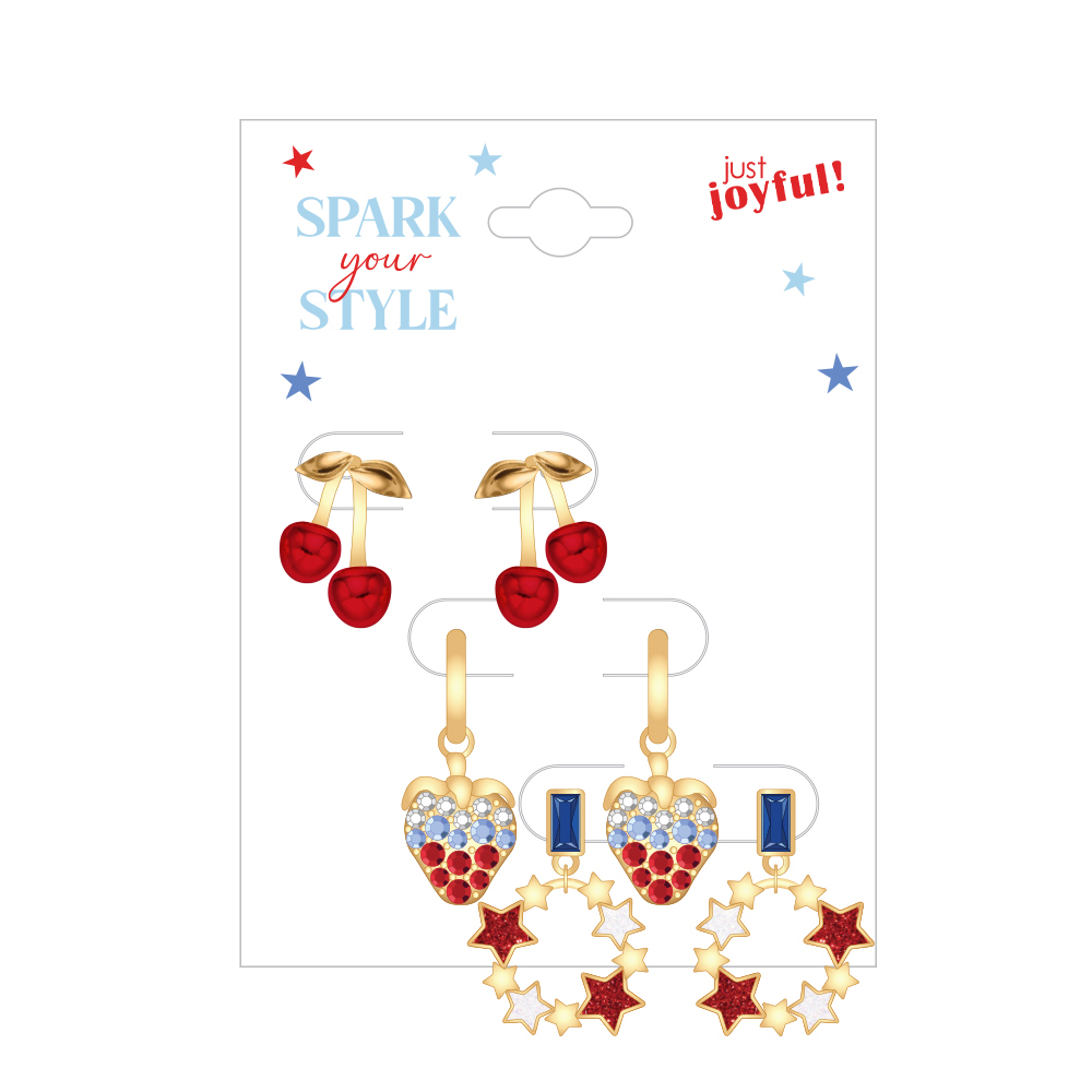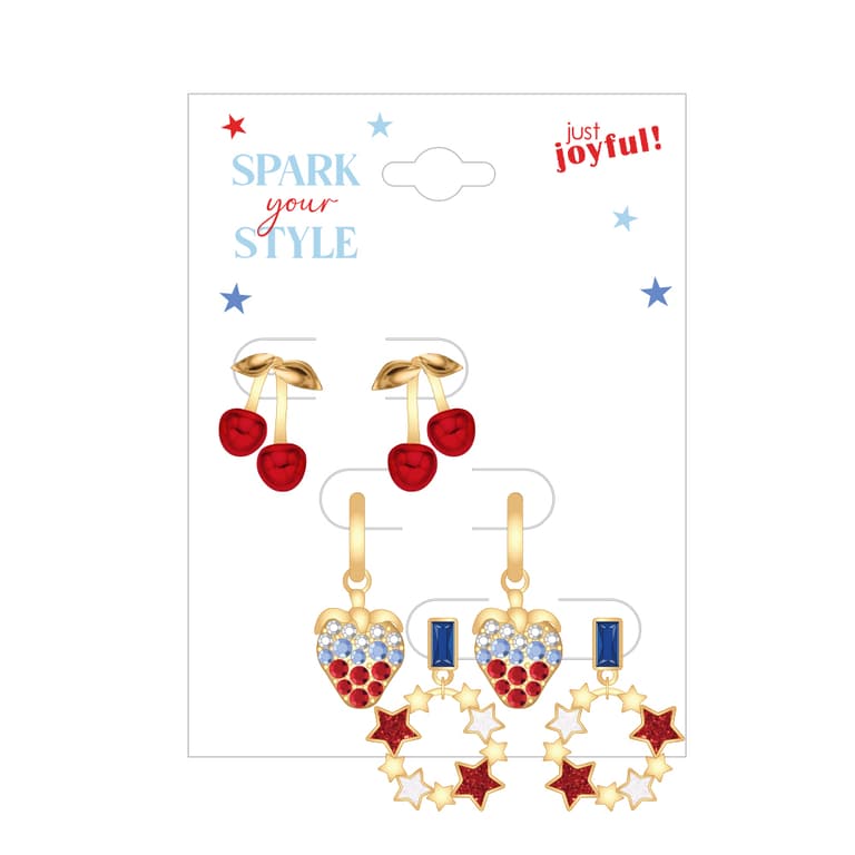 A delightful set of red, white, and blue earrings featuring cherries, sparkling stars, and Americana motifs. A versatile, fun-loving collection that brings celebratory charm to picnics, parades, and every star-spangled summer moment.Specifications