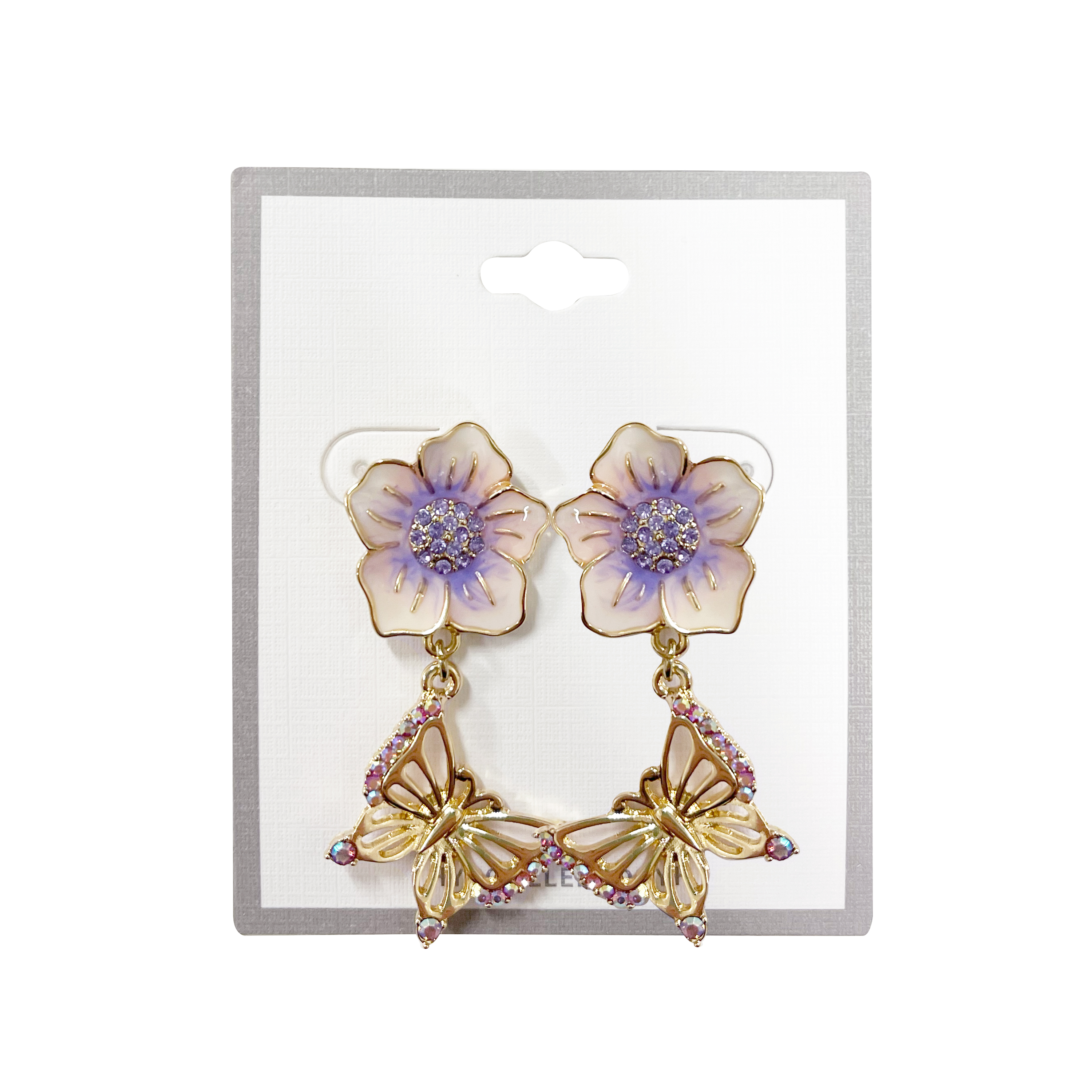 Elevate your jewelry collection with these fun earrings featuring delicate purple flowers and golden butterflies. Their charming design adds a playful and elegant touch to any outfit. Perfect for brightening up your look with a touch of nature-inspired beauty.Specifications