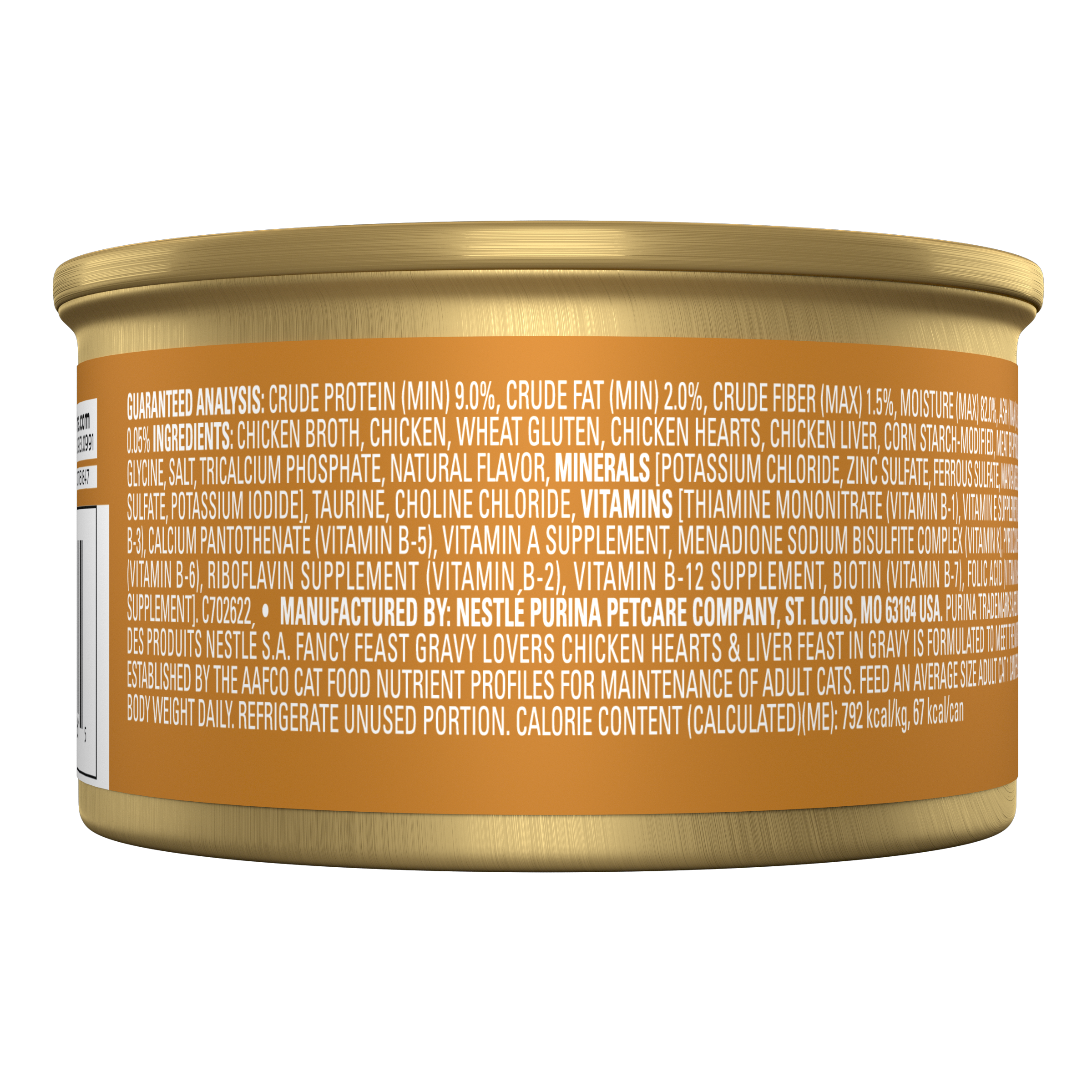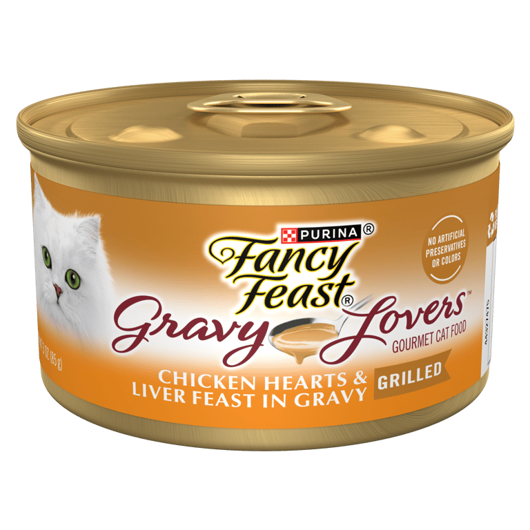 Delight your cat with an exceptional mealtime experience with Purina Fancy Feast Gravy Lovers Chicken Hearts and Liver Feast Gourmet Cat Food in Wet Cat Food Gravy. Crafted in partnership with our expert nutritionists, this protein-rich, soft cat food features the irresistible taste of real chicken and delivers 100 percent complete and balanced nutrition for adult cats. This flavorful, high-quality chicken hearts and liver feast in gravy cat food includes a blend of cat vitamins and minerals to support their whole body health with an enticing gravy lovers cat food taste. This Fancy Feast canned cat food is made without artificial colors or preservatives, so your cat gets everything they need and nothing they don’t. Show your cat some love with the spellbinding aroma and irresistible gourmet meal flavor of Purina Fancy Feast Gravy Lovers Chicken Hearts and Liver Feast Gourmet Cat Food in Wet Cat Food Gravy. Each can is tested for quality and safety in Purina-owned U.S. facilities.Specifications