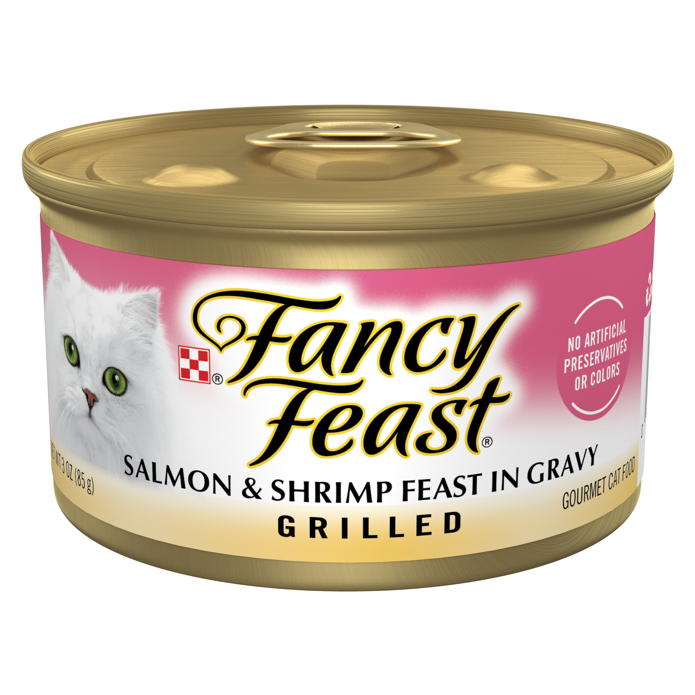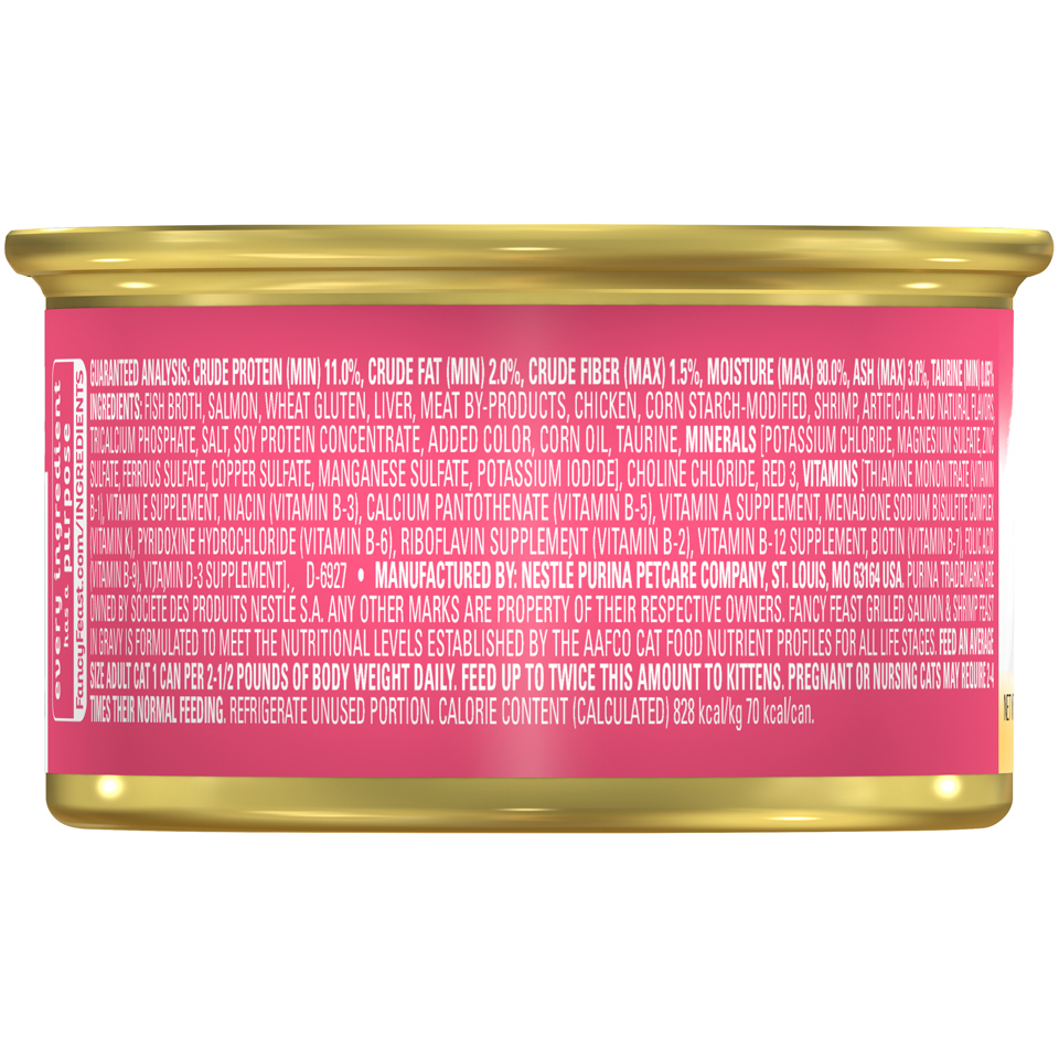 Let Fancy Feast delight your cat with an exceptional mealtime experience every time you open a can of Fancy Feast Grilled Cat Food Salmon and Shrimp in Gravy Cat Food. Crafted in partnership with our expert chefs and nutritionists, this protein-rich, wet food for cats features the irresistible taste combination of real salmon while delivering 100 percent complete and balanced nourishment. Also included in this flavorful, high-quality soft cat food is a blend of vitamins and minerals to support your cat’s whole-body health and a light, savory cat food gravy to tempt their tastebuds. This premium canned cat food recipe is made without artificial colors or preservatives, so you know your cat is getting everything they need and nothing they don’t. Show your cat how much you care with a can of Grilled Fancy Feast wet cat food and watch them savor the spellbinding aroma, enticing texture and delectable flavor sensation down to the very last bite.Specifications