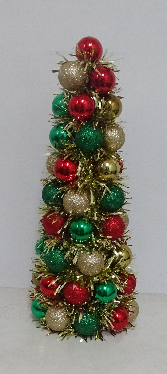 17" Christmas Shatterproof Glitter Ball Cone Tree; Red & Gold Balls With Gold Tinsel. It is the perfect size for small little corners that need some Christmas spirit and is suitable as a centerpiece on coffee table, windowsill, mantle or desk.Specifications