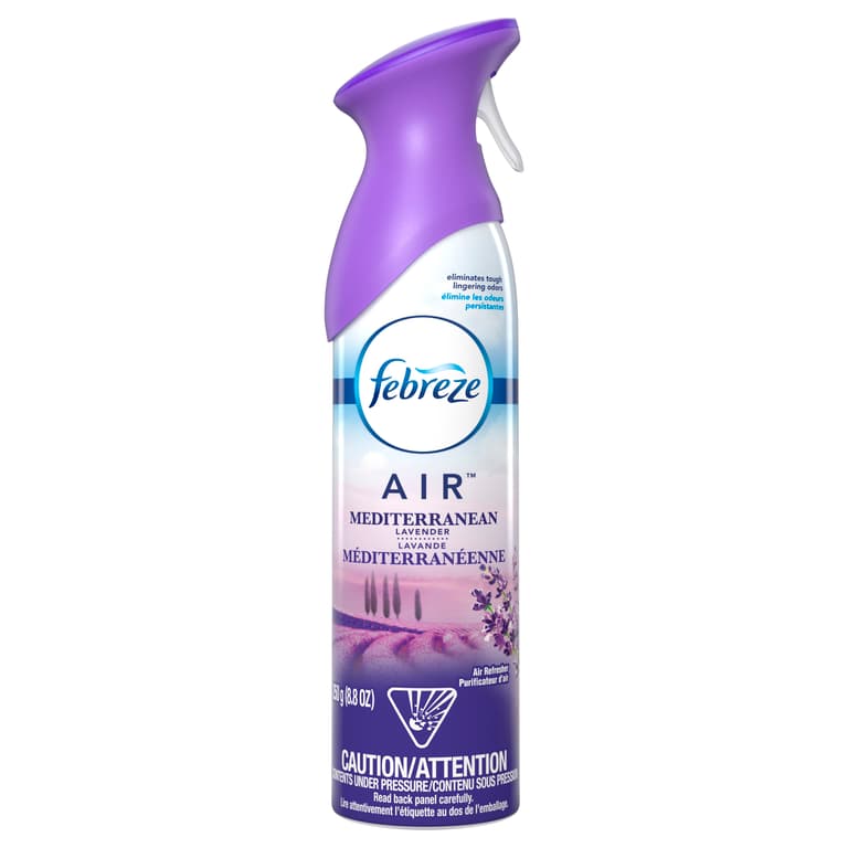 Whether its smoke trash or pet odors Febreze doesnt just mask odors it cleans them away with OdorClear Technology leaving your air with a light fresh scent. Arm your indoor areas with a can and dont be afraid to take in a deep breath. Reach for Febreze AIR to eliminate odors on the spot. Spray the air in a sweeping motion throughout the entire room to clean away odors from everyday pet and bathroom smells to stubborn smoke and leftover cooking odors. With Febreze Air Effects air freshener you can kick odors out and invite freshness in. Scent: Mediterranean LavenderSpecifications