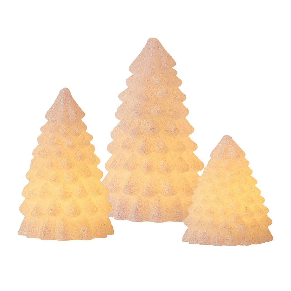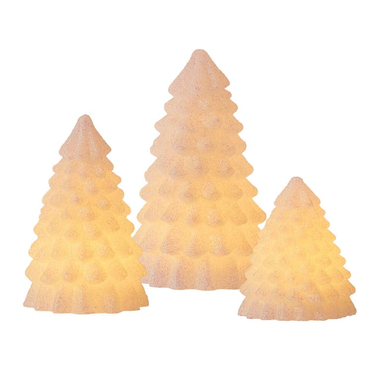 Safely create a warm lighting scheme in any room with this Set of 3 LED Wax Christmas Trees by FITZ&FLOYD. The LED flickering flames create the soft, ambient glow of candlelight without smoke or wax drippings. These festive tree figurines bring the Holiday spirit to your bedroom, bathroom, living room, and more. Includes a convenient 10 key remote. Requires 2 AA batteries each, not included. Set includes: one 3.5 inch x 4 inch, one 3.75 inch x 6 inch, and one 4.25 inch x 7.5 inch figurine.Specifications