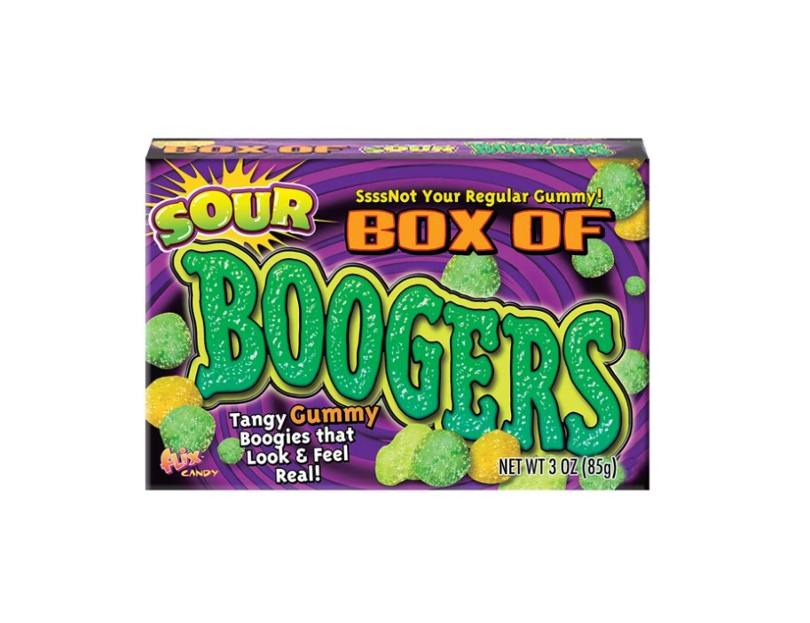 FLIX CANDYS FAMOUS BOX OF BOOGERS CONTINUES TO BE A HALLOWEEN FAVORITE. THESE SOUR GUMMY CANDIES COME IN A VARIETY OF FUN SHAPES AND DELICIOUS SOUR SWEET FRUIT FLAVORS. THIS IS A FRIGHTFULLY FUN CHOICE FOR HALLOWEEN THIS YEAR AND EVERY YEAR.Specifications