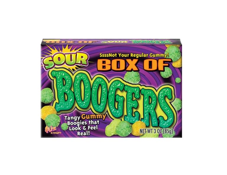 HALLOWEEN THEMED; SHAPED LIKE BOOGERS; SOUR FRUIT FLAVORS; THEATER BOX