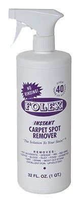 FOLEX instant carpet spot remover is different! Safely removing tough spots and stains from colorfast carpet, rugs, upholstery and clothing, is beyond the ability of most cleaning chemicals. Some spotters may remove carpet and rug stains, other spotters might remove upholstery and clothing stains. Another cleaning chemical may remove food spots from upholstery, but not pet stains from rugs and carpet. For over 40 years, the FOLEX COMPANY has been producing the cleaning chemical that can remove virtually any stain, from practically any colorfast carpet, rug, upholstery, and clothing. Cleaning is easy with FOLEX.Specifications