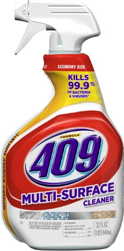 Formula 409 Multi-Surface Cleaner, is the ultimate cleaner, degreaser and disinfectant for your home. The antibacterial formula quickly cuts through grease and grime and disinfects as you wipe, killing over 99% of germs. It prevents mold and mildew growth and deodorizes as you clean your kitchen and bathroom surfaces, leaving behind a fresh scent. This no bleach, non abrasive, all purpose spray cleaner now cleans 40% more per spray, based on lab testing vs. previous offering, and with this bottles Smart Tube technology you are guaranteed to spray every last drop. This household cleaner works great both indoors and outdoors on a wide range of hard nonporous surfaces including stovetops, sinks, countertops, microwave exteriors and more. Multi-Surface Cleaner, Spray Bottle Multi-Surface Cleaner, Spray Bottle.Specifications
