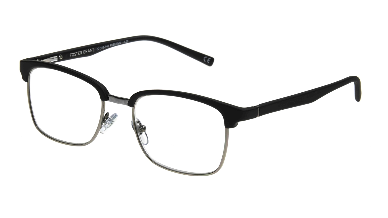 Foster Grant Alden Reading Glasses offers a modern twist on an iconic shape. This plastic/metal combination frame has a matte black top bar paired with a dark gun colored eye rim 2.75 DIOPTERSpecifications