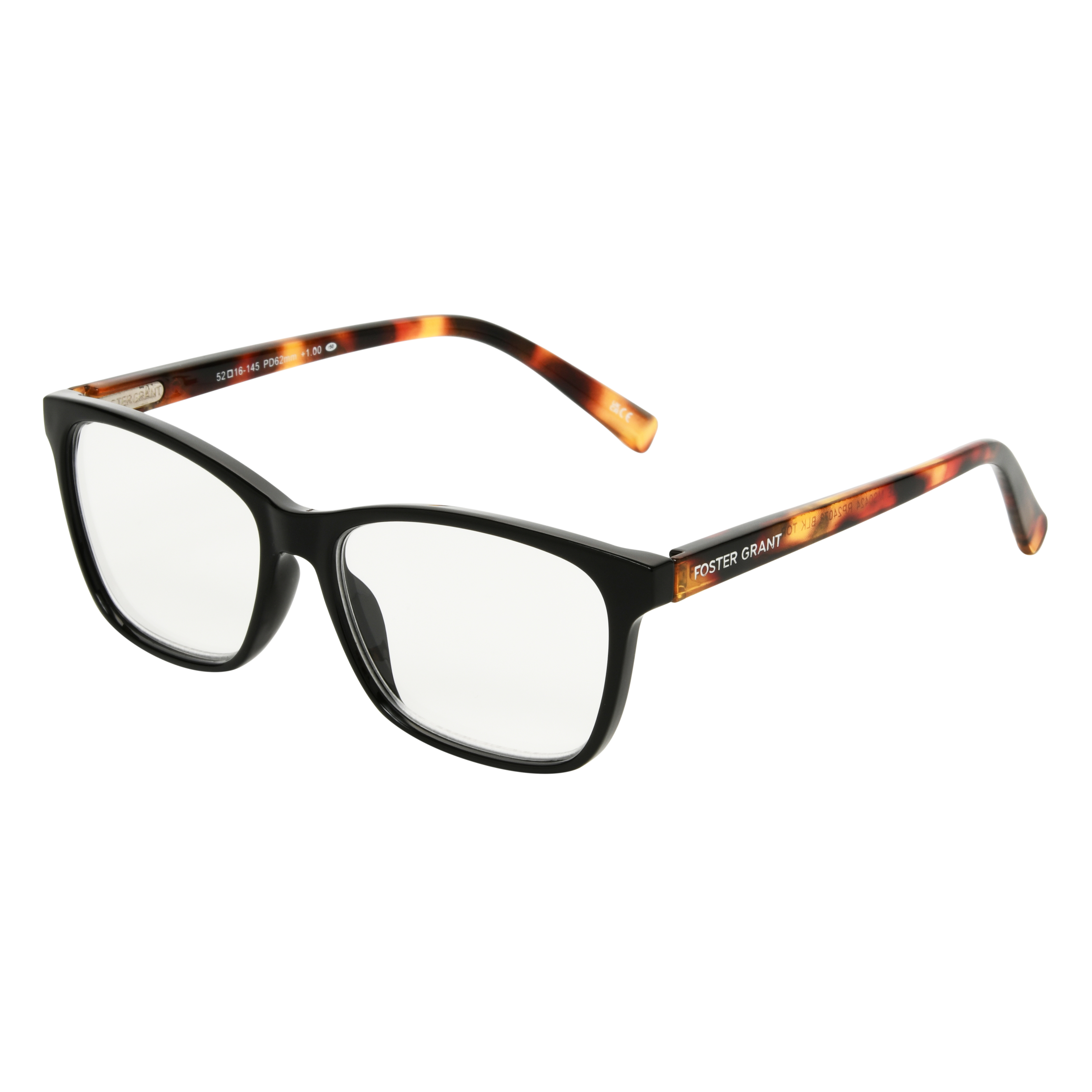 These Foster Grant Ladies Reader Black Cat Eye Women's Glasses feature a classic full-rim design in sleek black with subtle tortoise-patterned temple tips for added style. The plastic lenses are scratch-resistant, ensuring long-lasting clarity. A slip-in case is included, making them a practical and stylish choice for daily reading.Specifications