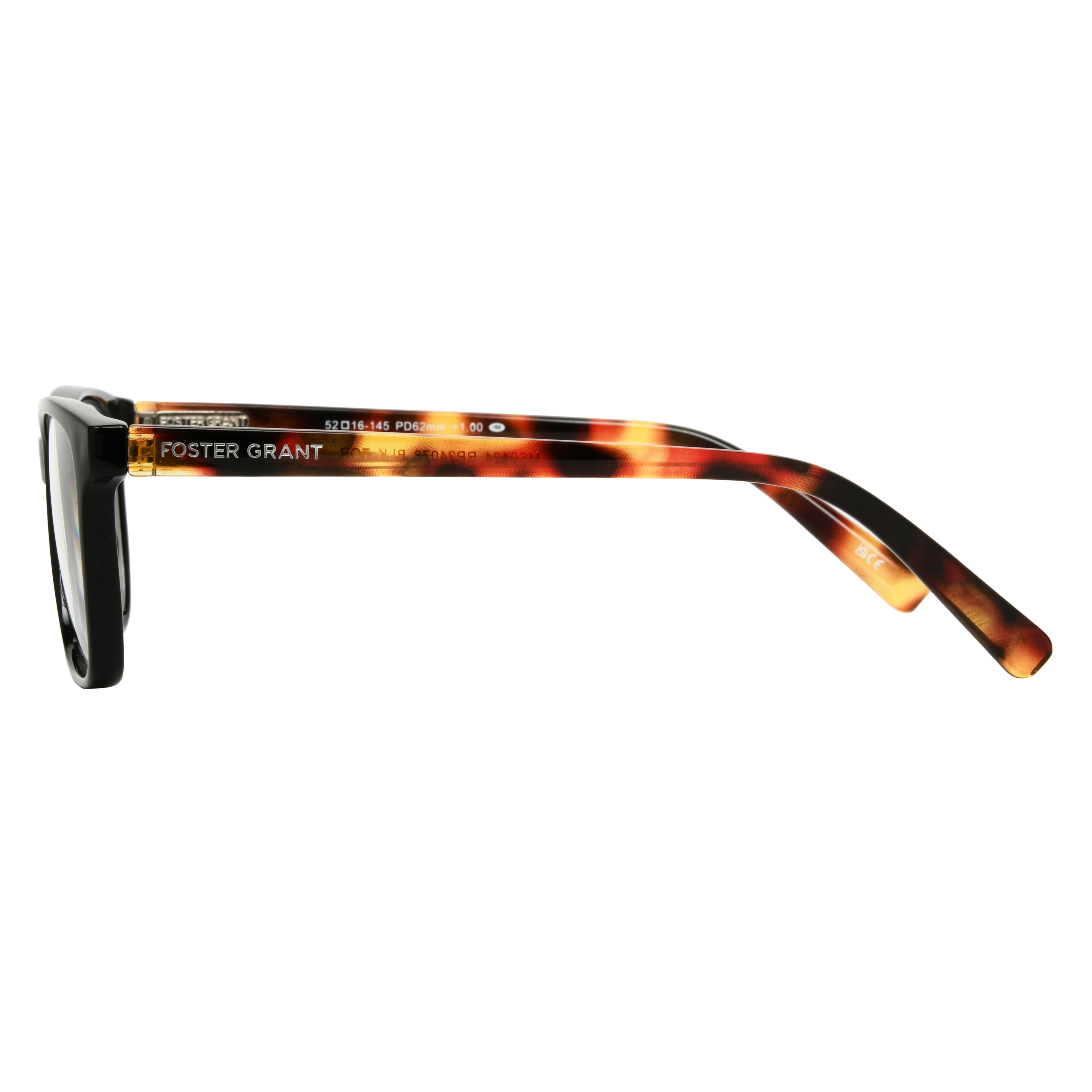 These Foster Grant Ladies Reader Black Cat Eye Women's Glasses feature a classic full-rim design in sleek black with subtle tortoise-patterned temple tips for added style. The plastic lenses are scratch-resistant, ensuring long-lasting clarity. A slip-in case is included, making them a practical and stylish choice for daily reading.Specifications