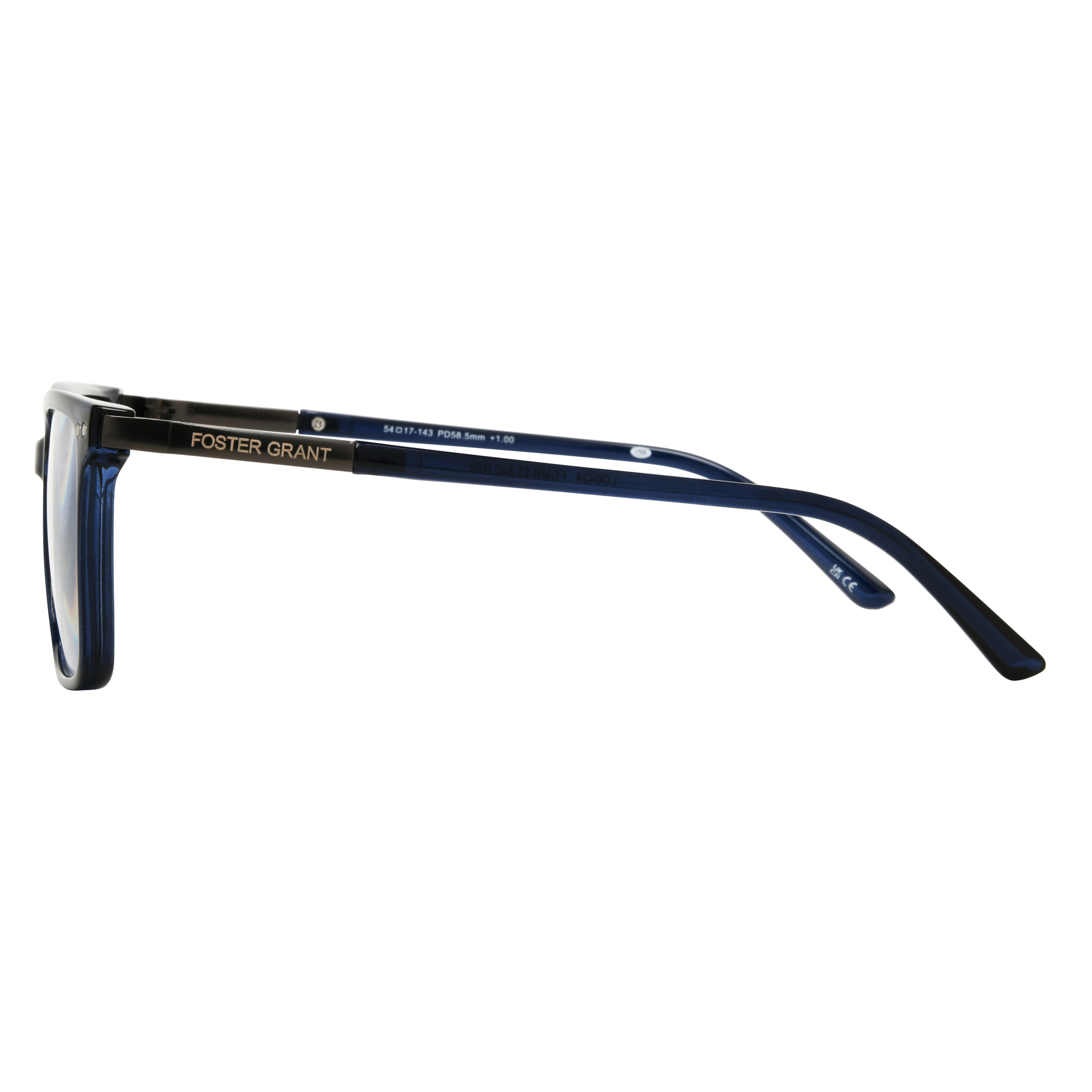 These sophisticated Foster Grant Men's Readers feature a sleek navy blue frame with a modern square design, perfect for a polished and professional look. Designed to provide comfortable wearability without compromising style. Available in a range of diopters to meet your reading magnification needs.Specifications