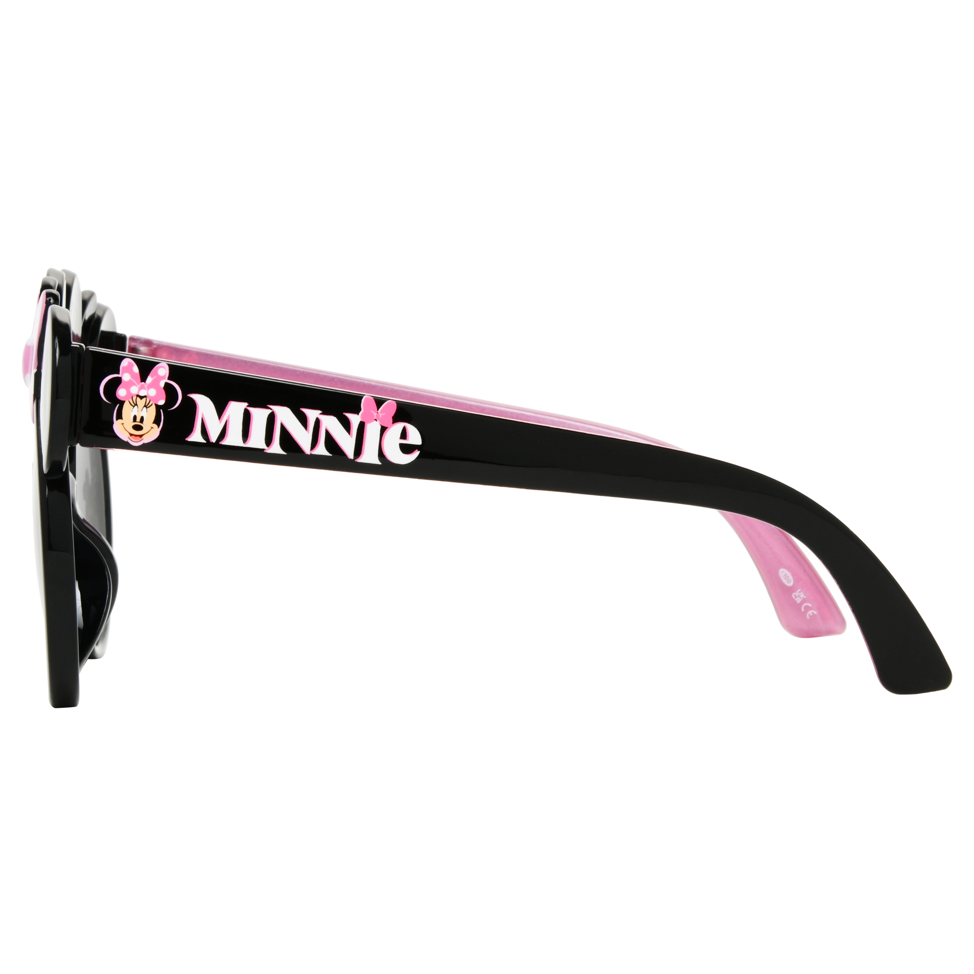 These Disney Minnie Mouse inspired Kids Sunglasses add playful charm with their novelty round frames topped with Minnie’s signature ears and a pink polka-dot bow.The fun black-and-pink design makes them a perfect accessory for little fans of Minnie.The lenses, made with plastic, are scratch and impact-resistant and provide 100% UVA-UVB lens protection.Cute and protective from the sun's rays, these shades bring Disney magic to every sunny day.Specifications