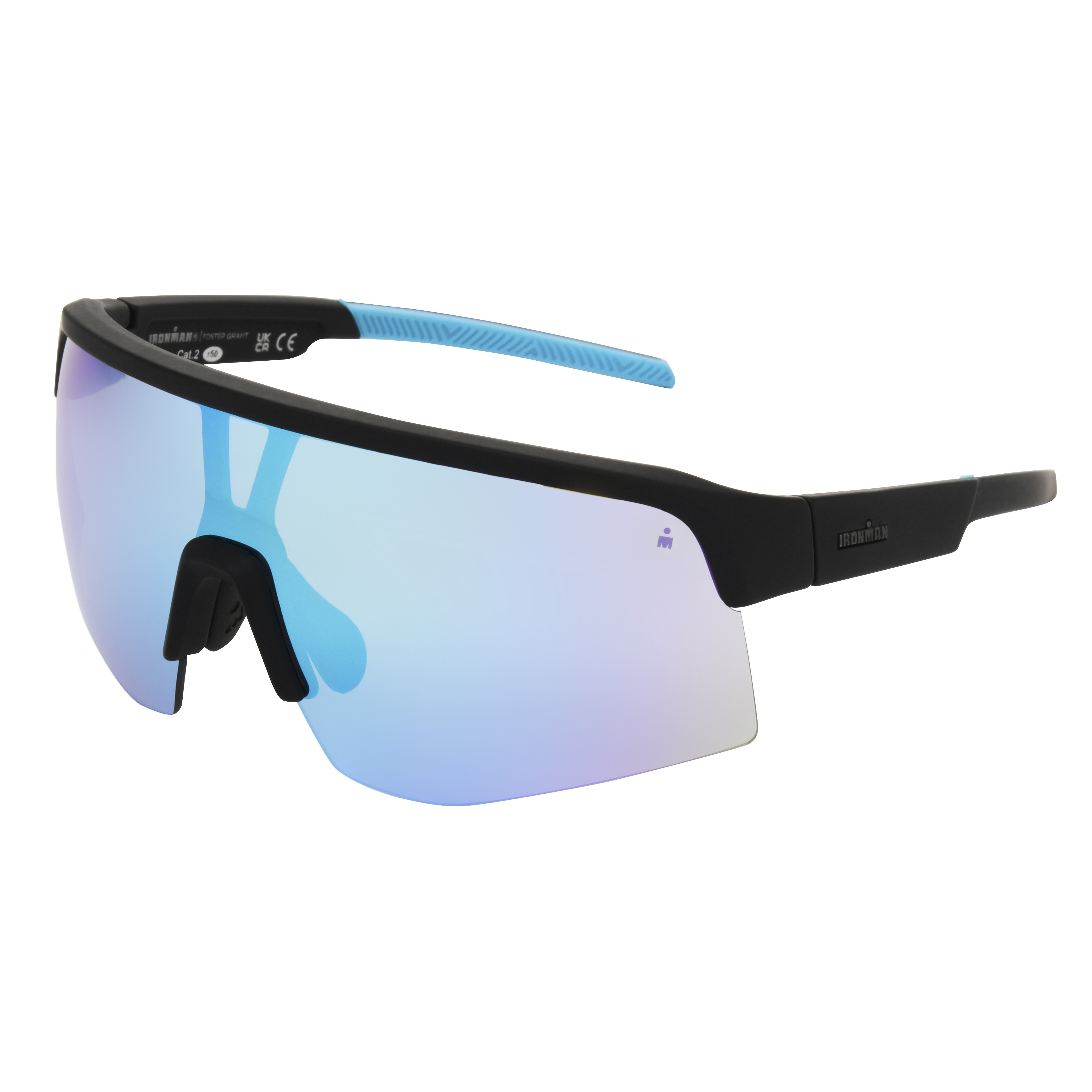 These Foster Grant IRONMAN Shield Blue Sunglasses sport a bold shield-style semi-rim design made for peak performance and modern style. The sleek black frame pairs with mirrored turquoise lenses for a striking athletic edge. Made with recycled plastic, the lenses are scratch and impact-resistant and provide 100% UVA-UVB lens protection. Built for action, they’re perfect for training, racing, or everyday adventure.Specifications