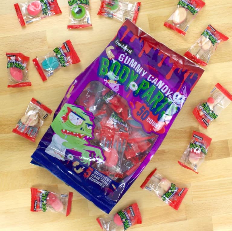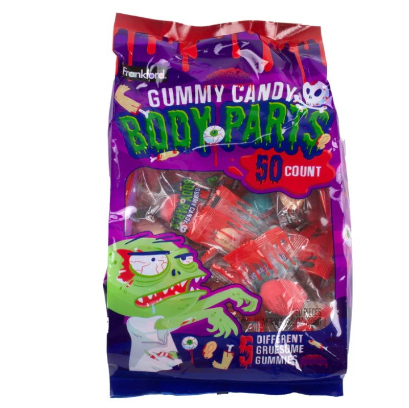 50 CT; FRUIT FLAVORS; GUMMY BODY PARTS INCLUDE FINGERS, LEGS, EYE BALLS, EARS AND BRAINS; INDIVIDUALLY WRAPPED