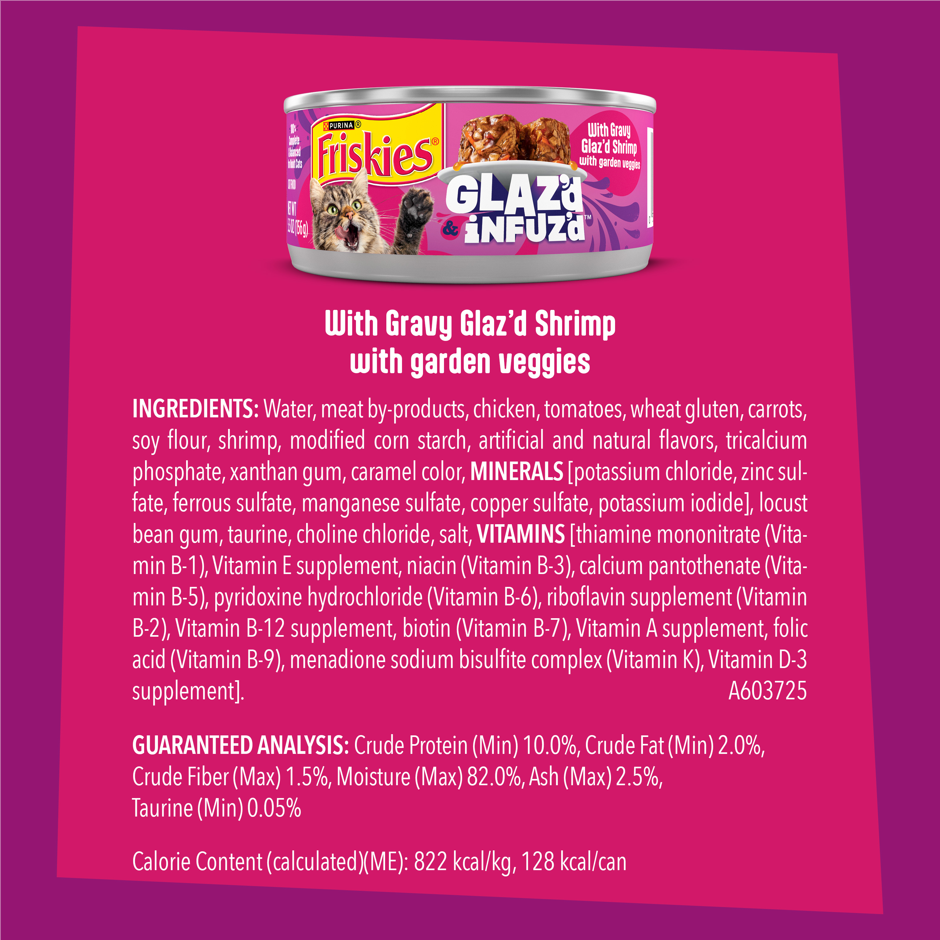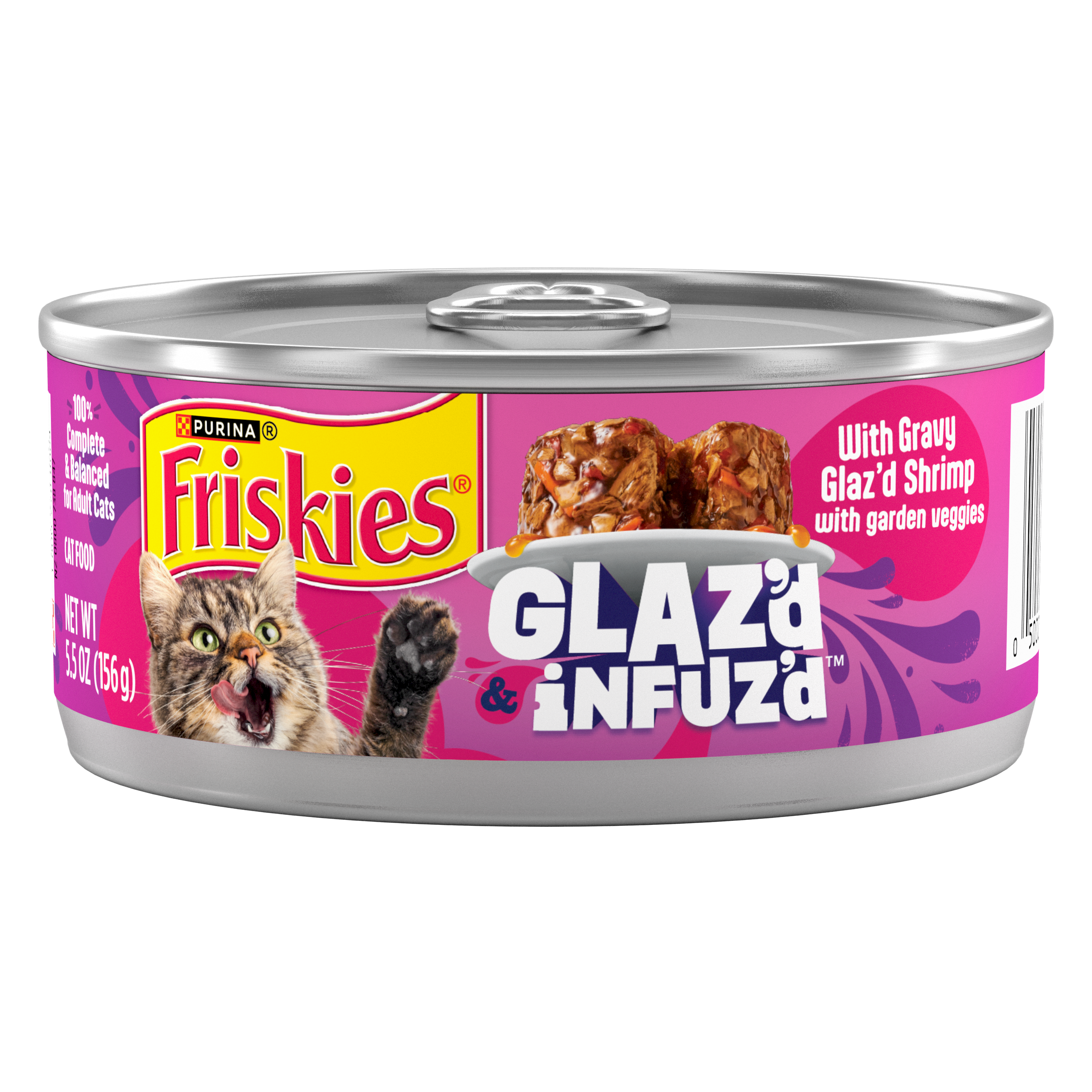 Hydration for Cats: Friskies canned cat food delivers healthy hydration with a taste and texture cats love.; Made with Shrimp Cat Food: Purina Friskies Glaz’d and Infuz’d Wet Cat Food features high-quality protein for a complete adult cat food.; Super Chunky with Gravy Cat Food: Wet food cats love features meaty, chunky morsels coated in a thick gravy glaze that sticks to every bite.