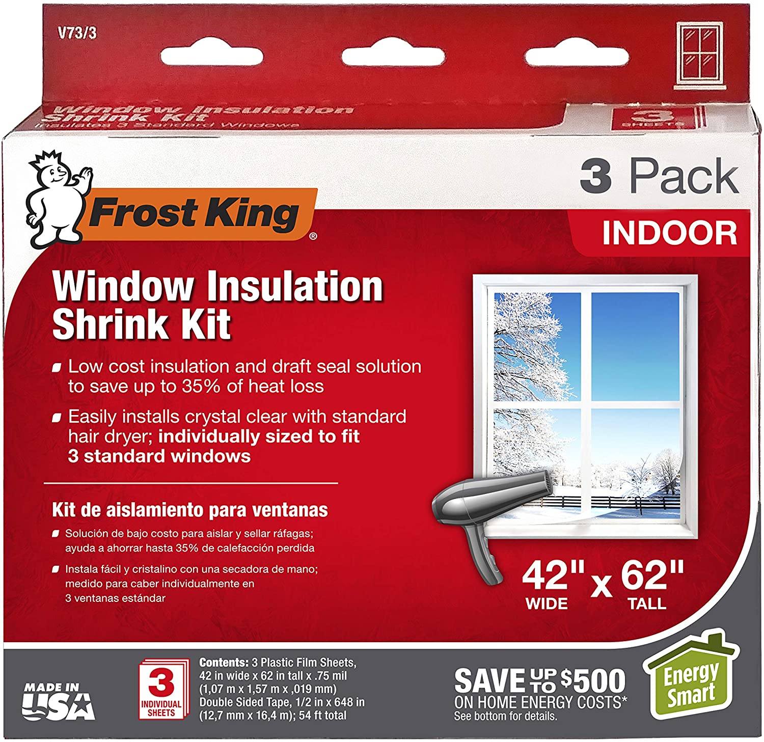 Insulate your windows with the help of the FROST KING Shrink Window Kit (V73/3H). Suitable for use on standard size windows, it's easy to apply with a blow dryer. It is made from polyolefin and is available in clear, so you can still see through your windows once applied. The Frost King Window insulation kit includes three sheets, so you have enough to insulate multiple windows in your home.Specifications
