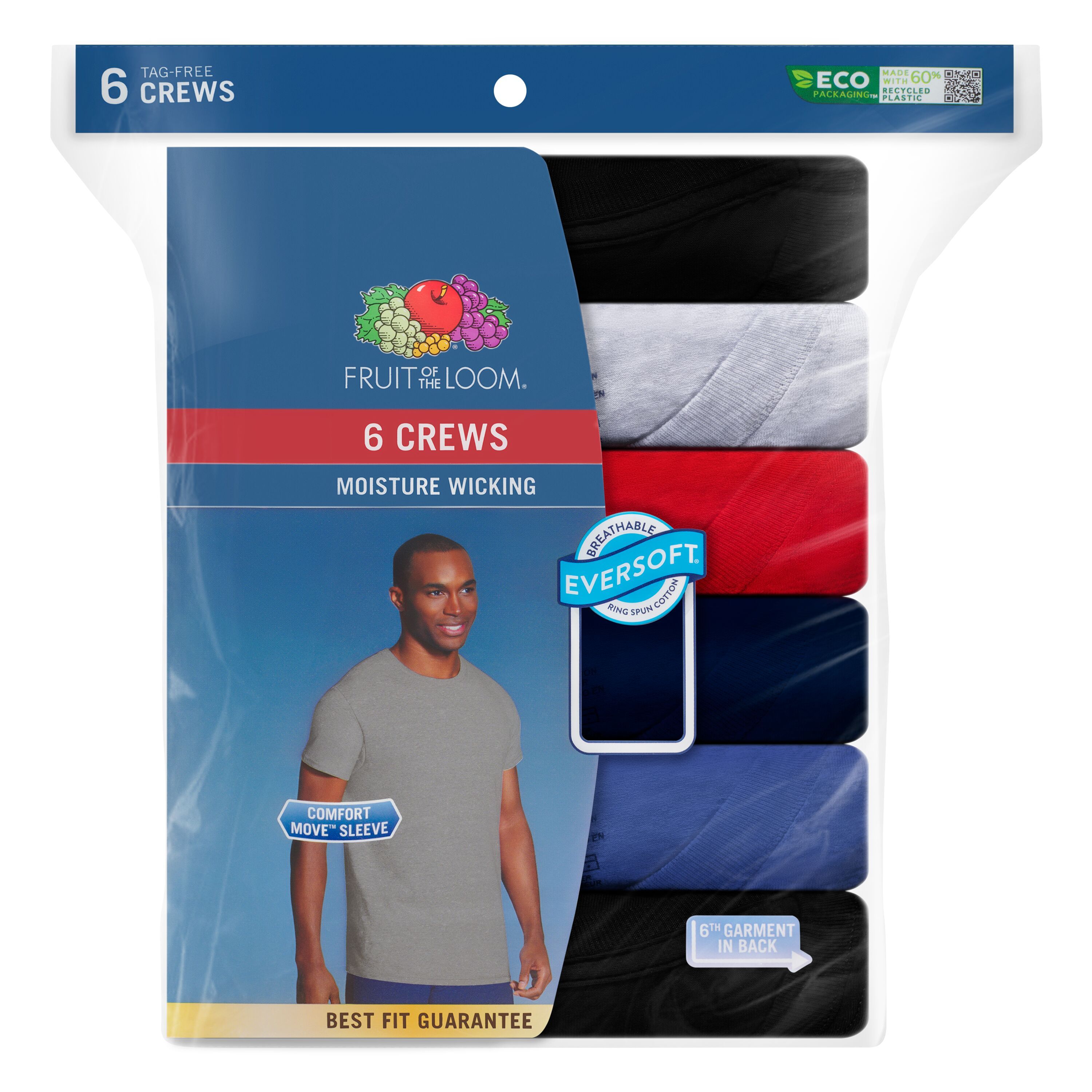 FRUIT OF THE LOOM MEN'S ASSORTED CREWS WORK GREAT ALONE OR TO ADD AN EXTRA LAYER UNDER A BUTTON-DOWN OR POLO SHIRT; THIS SHIRT ELIMINATES RIDE-UP AND IT STAYS NEATLY TUCKED SO YOU CAN GO ABOUT YOUR BUSY DAY WITH CONFIDENCE; THEY ARE DESIGNED TO MAINTAIN COMFORT AND SOFTNESS EVEN AFTER MANY WASHES; THIS GREAT T-SHIRT FEATURES A DESIGNED TO PROVIDE ALL-DAY COMFORT.Specifications