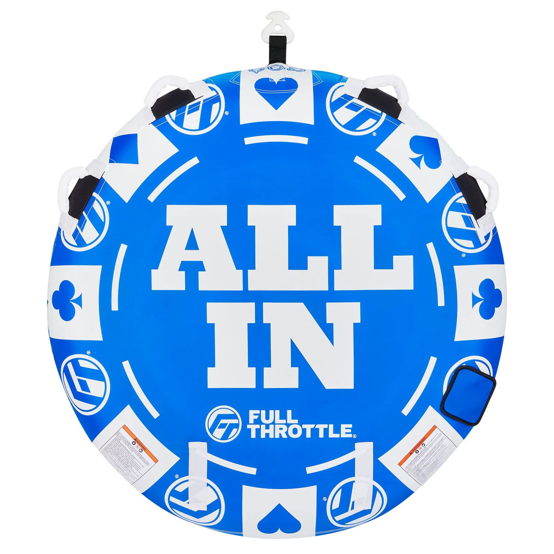 Towable 2 Rider Tube, Rope and Pump Combo Pack, Comfort handles with neoprene knuckle guards, Rugged and durable nylon cover, 60" tube, Max. weight 340 lbs., 12V accessory outlet w 2 adaptors fit inflation and deflation portsSpecifications