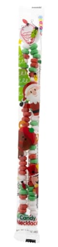 CELEBRATE THE HOLIDAY SEASON IN STYLE WITH THIS SANTA CANDY NECKLACE. THE LONG CANDY BEAD NECKLACE IS COLORED IN TRADITIONAL RED, GREEN, AND WHITE WITH SANTA ON THE PENDANT FOR A FUN CHRISTMAS ACCESSORY. WEAR IT, SHARE IT, OR GIFT IT. THIS FESTIVE TREAT IS PERFECT FOR CHRISTMAS PARTIES, STOCKING STUFFERS, OR JUST AS A SWEET SNACK TO ENJOY. EACH NECKLACE COMES IN A PRINTED CHRISTMAS CHARACTER BAG WITH JOLLY SANTA AND HIS FRIENDS.Specifications