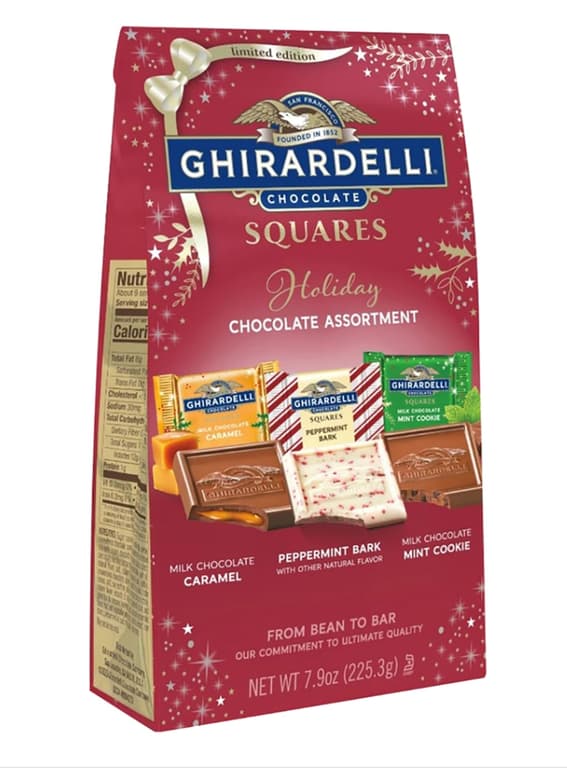 SPREAD CHRISTMAS CHEER THIS YEAR WITH EVERYONES FAVORITE GHIRARDELLI HOLIDAY CHOCOLATE SQUARES.THESE INDIVIDUALLY WRAPPED CHOCOLATES ARE PERFECT FOR GIFT GIVING OR SHARING WITH YOUR FRIENDS AND FAMILY.Specifications