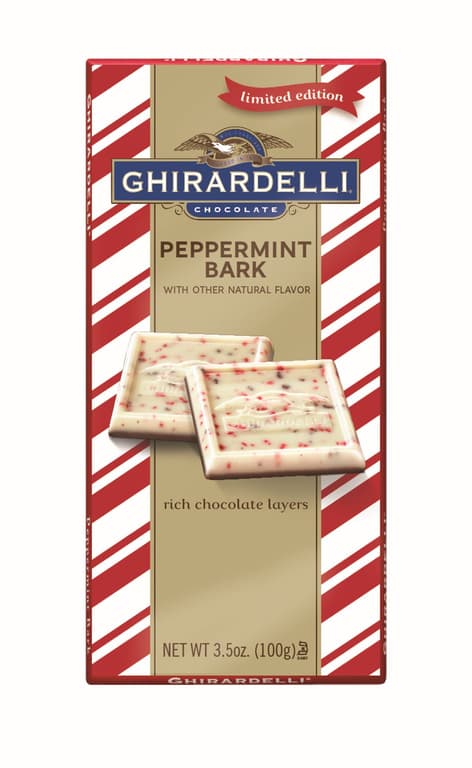 Contains Milk, Soy, Tree Nuts; Each kosher chocolate bar is made with premium ingredients and high quality cocoa beans for signature intense, slow-melting taste; Holiday candy featuring festive peppermint white chocolate layered with decadent, rich chocolate; Holiday chocolate and peppermint candy bar ideal for a stocking stuffer, entertaining and personal enjoyment; Individually wrapped Christmas candy bar is a perfectly sized kosher treat; One (1) 3.5 oz Ghirardelli Peppermint Bark Bar; Peppermint Bark Bar features decadent, rich chocolate layers and festive peppermint flavor; White chocolate peppermint candy made with high quality ingredients