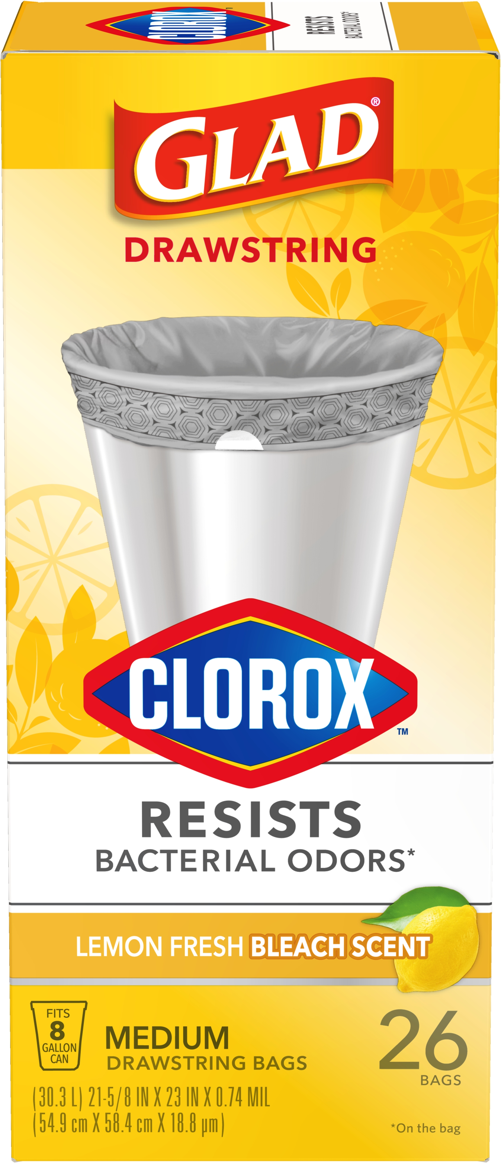 Glad and Clorox have joined forces to create a trash bag with the strength of Glad and the odor-fighting power of Clorox. Glad with Clorox Medium Drawstring Trash Bags resists bacterial odors on the bag to keep your home feeling clean and healthy. These 8 gallon garbage bags fit medium size trash cans and are ideal for bathrooms, bedrooms, offices, nurseries and laundry rooms. Featuring a grey bag and printed hexagon design around the hem of the bag, these trash bags add a design detail to any room when they are folded around the edge of the can. Just a quick cinch of the durable drawstring makes trash removal simple. These versatile trash bags feature the clean smell of Lemon Fresh Bleach Scent. Glad with Clorox garbage bags work as hard as you do to maintain a clean and healthy home with a versatile design for bins around the home.Specifications