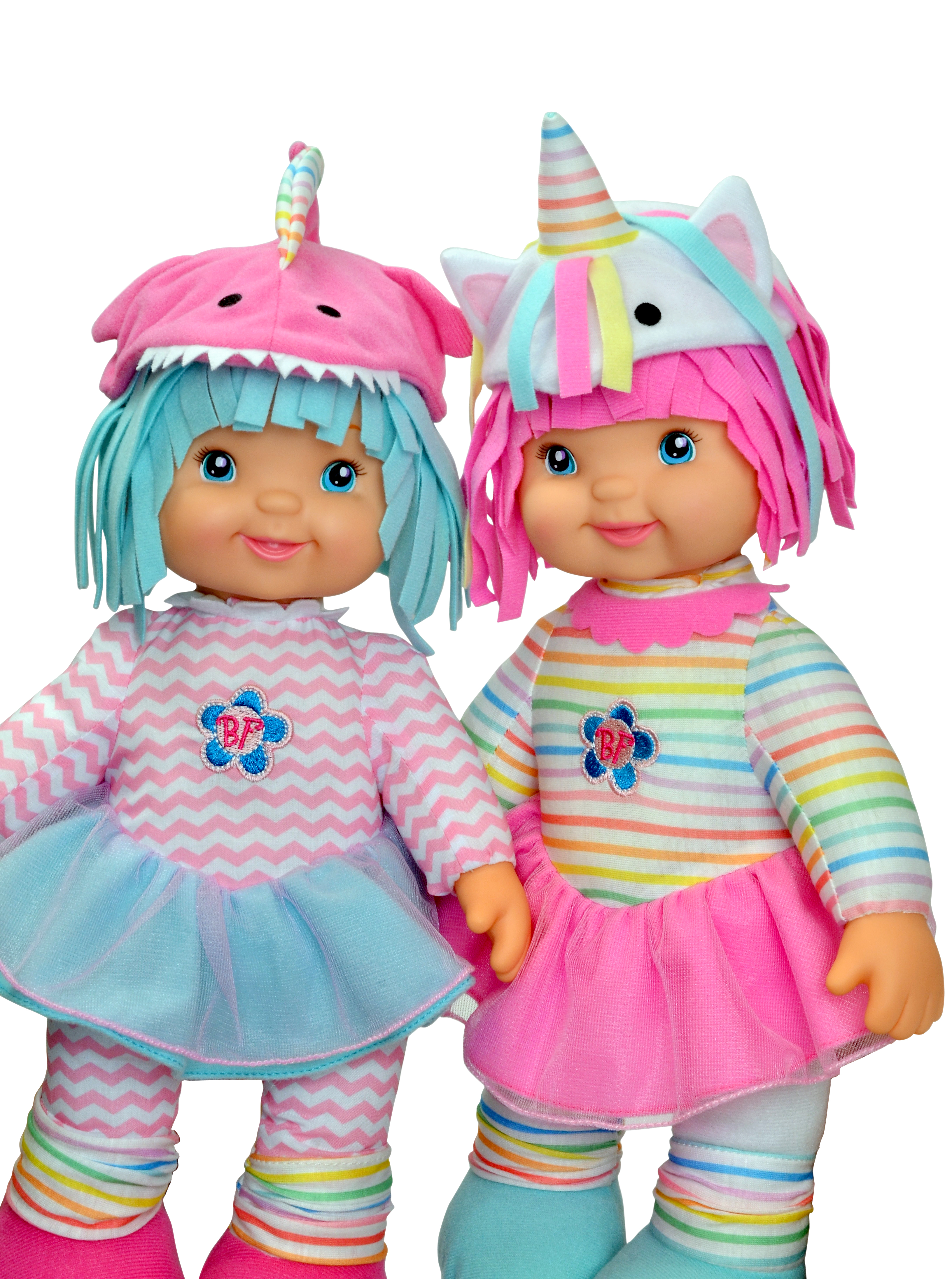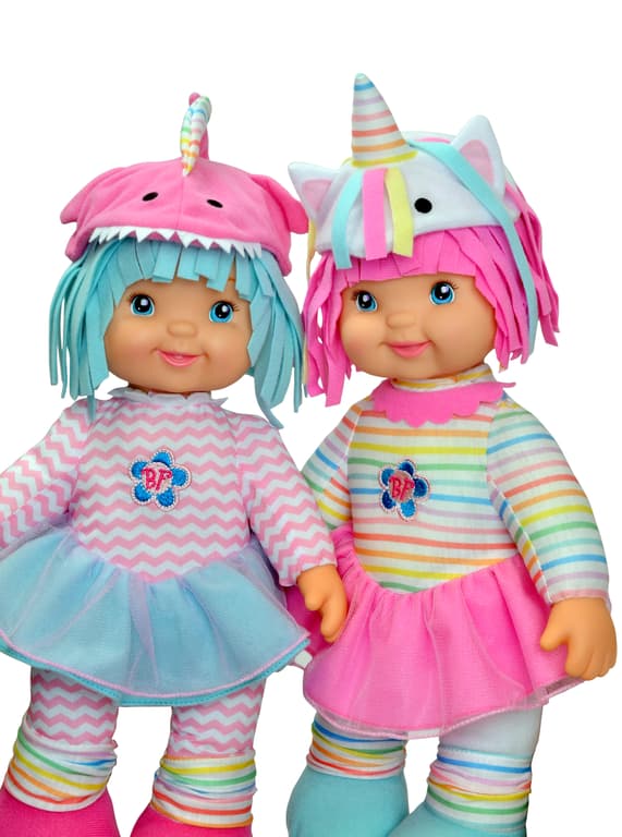15 soft body doll; Colorful outfits with matching themed hats; Comes in popular themes - a Unicorn (with horn, mane & tail) and a Shark (with dorsal fin and many teeth); machine washable