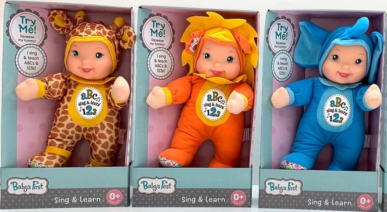 Goldberger Doll Baby's First Sing & Learn Giraffe Bi-Lingual (English/Spanish) is a wonderful "Learning Toy" for young children. Simply press it's tummy to hear the Giraffe count 1 to 10 or recite the alphabet in both English and Spanish. Dress in an adorable Giraffe costume this doll is a wonderful companion and will entertain them for hours. This Sing & Learn Giraffe is machines washable and comes with the Goldberger Doll Lifetime guarantee. The Age Grading of the Sing & Learn Giraffe is 0 years and up. Two AG3 button cell batteries are included with the doll. Counts 1 to 10 in English and Spanish when you press the doll's tummy.Specifications