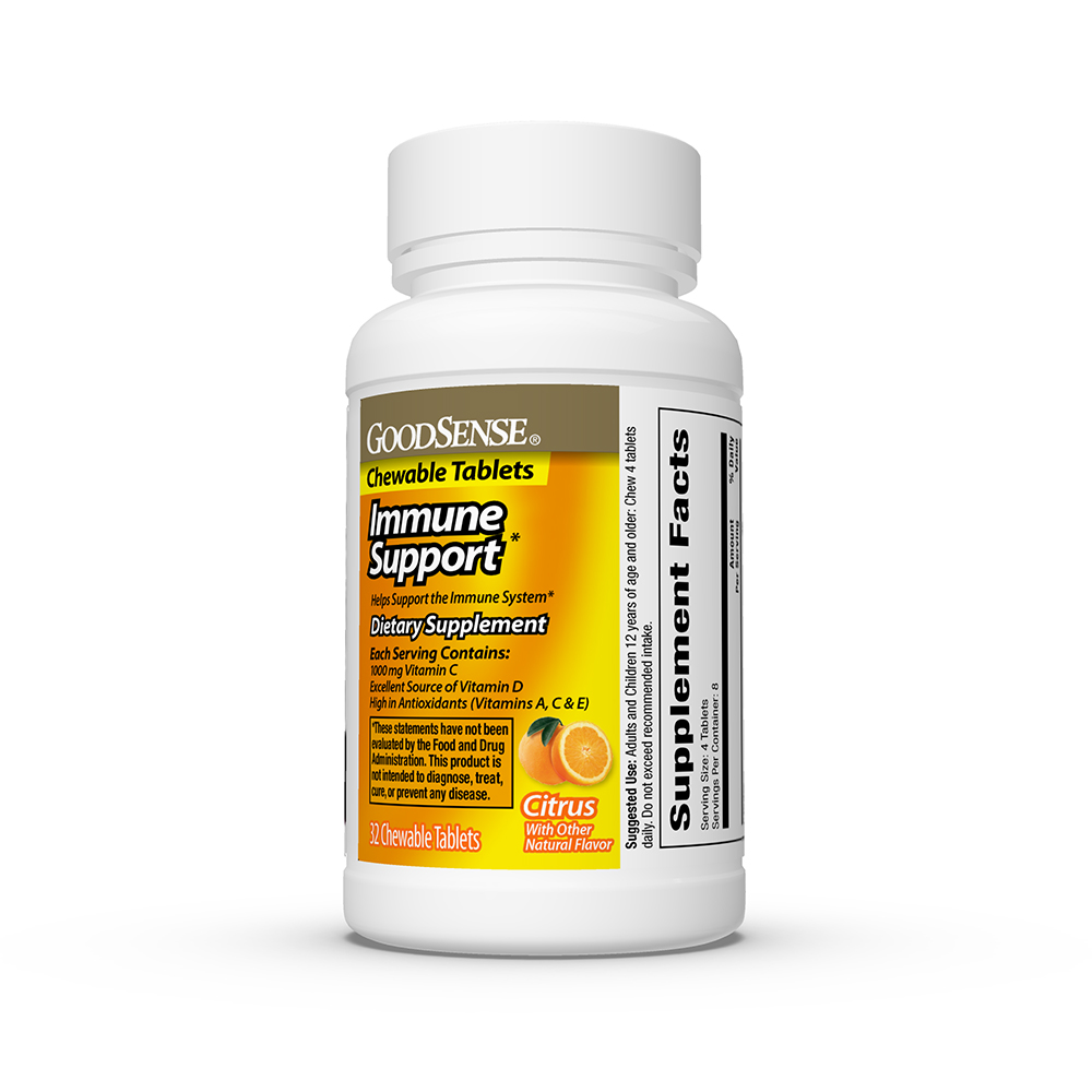 GoodSense Immune Support Chewable Tablets are a custom blend of 10 vitamins, minerals, and herbs, including 1.000 mg of Vitamin C per serving. Compare to the ingredients in Airborne Chewable Tablets. Immune Support Chewable Tablets are a convenient way to support immune system health with Vitamin C and Vitamin D with a citrus flavor.Specifications