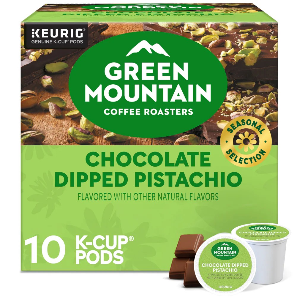 At Green Mountain Coffee Roasters, farmers power our coffee. All while delivering the nutty, sweet flavors of Chocolate Dipped Pistachio single serve K-Cup pods, with the flavors of roasted pistachios and sweet milk chocolate mingling in perfect harmony. Chocolate Dipped Pistachio is Certified Orthodox Union Kosher. Farm Grown Goodness that’s expertly crafted, smooth, and balanced. Chocolate Dipped Pistachio caffeinated coffee is a bright start to the morning, with the flavors of roasted pistachios and sweet milk chocolate mingling in perfect harmony. Good coffee done right; 100% responsibly sourced and Certified Orthodox Union Kosher - so you can feel great about every cup. Contains genuine Keurig K-Cup pods, engineered for guaranteed quality and compatibility with all Keurig single serve coffee makers.VARIETY: Hot or iced; Decaf or full strength; Flavored or black; However you brew, we’ve got a cup for you;Specifications
