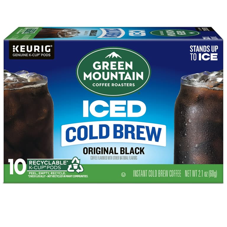 Contains genuine Keurig K-Cup pods, engineered for guaranteed quality and compatibility with all Keurig single serve coffee makers.; Green Mountain Coffee Roasters Iced Cold Brew coffee is specially crafted to stand up to ice. We start with expertly selected 100% Arabica coffee beans, steeped for hours, and then capture their peak flavor to infuse every refreshing sip with a rich, smooth taste.; Original Black Iced Cold Brew coffee is refreshingly smooth and full-flavored, with distinctive notes of chocolate.; Simple. Delicious. And recyclable. Enjoy the same great-tasting coffee you know and love, and when you’re done, just peel, empty, and recycle. Check locally, not recycled in many communities.; The mountains are a special place. It’s where Green Mountain Coffee Roasters was born. It’s where we developed our adventurous spirit and commitment to improving the lands through sustainably sourced coffee. We’re driven to bring the world a richer, better cup of coffee. Be bold. Be alive. Grab a cup and get out there.