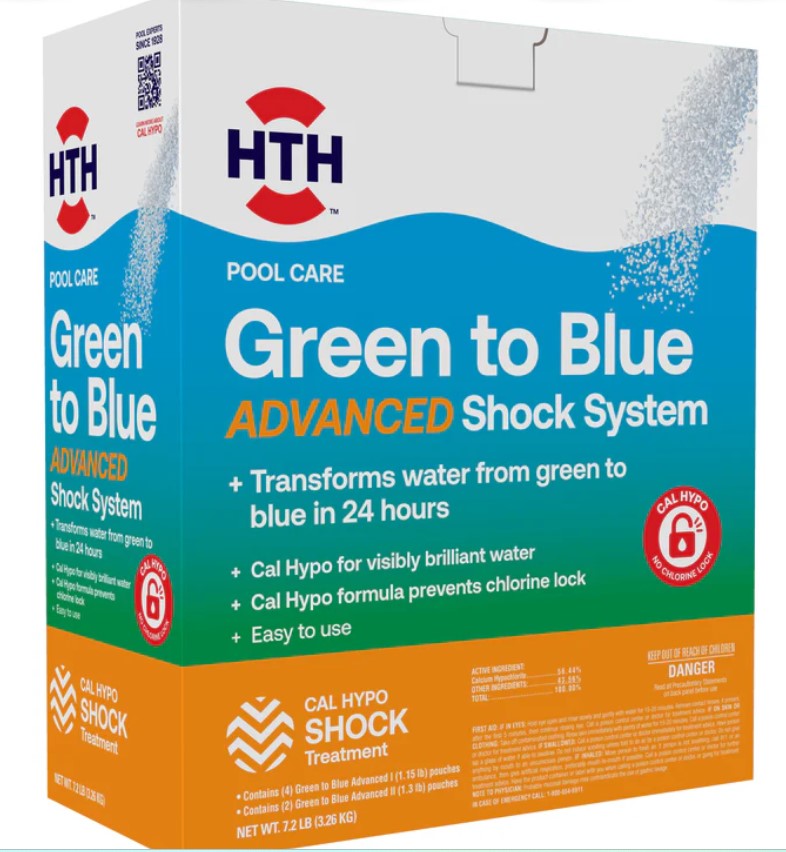 Fight severe algae bloom and return your pool to its clear blue appearance with the HTH Green to Blue Advanced Shock System for indoor and outdoor swimming pools. The two-step product shocks your pool with a boost of chlorine to kill bacteria and algae, then drops dead algae particles to the bottom of the pool with a flocculant for crystal clear water within 24 hours. Because the fast-acting formula dissolves quickly, your family can get back to swimming and relax as soon as possible. Contains four 1.15 pounds of Green to Blue Advanced I and two 1.3 pounds of Green to Blue II.Specifications
