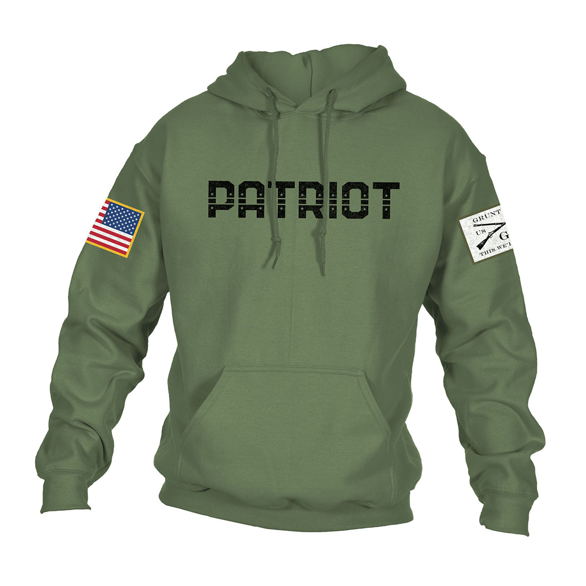 Patriots stand strong, ready to defend their country and uphold its values. Show your true colors with the Patriot Hoodie. Featuring a bold "Patriot" graphic, this military green hoodie is for those who bleed red, white, and blue. It's not just about pride; it's about patriotism and love for our country. Wear it and let everyone know where you stand.Specifications
