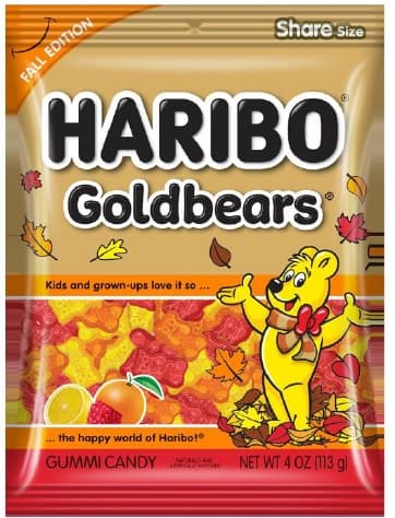 FALL LOVERS NOW HAVE THE PERFECT FESTIVE PAIRING TO ADD TO THEIR FALL FAVORITES WITH HARIBO GOLDBEAR GUMMY BEARS FALL EDITION. THESE GUMMY BEARS COME IN GORGEOUS FALL COLORS AND DELICIOUS FALL FLAVORS THAT INCLUDE RED RASPBERRY YELLOW LEMON AND ORANGE.Specifications
