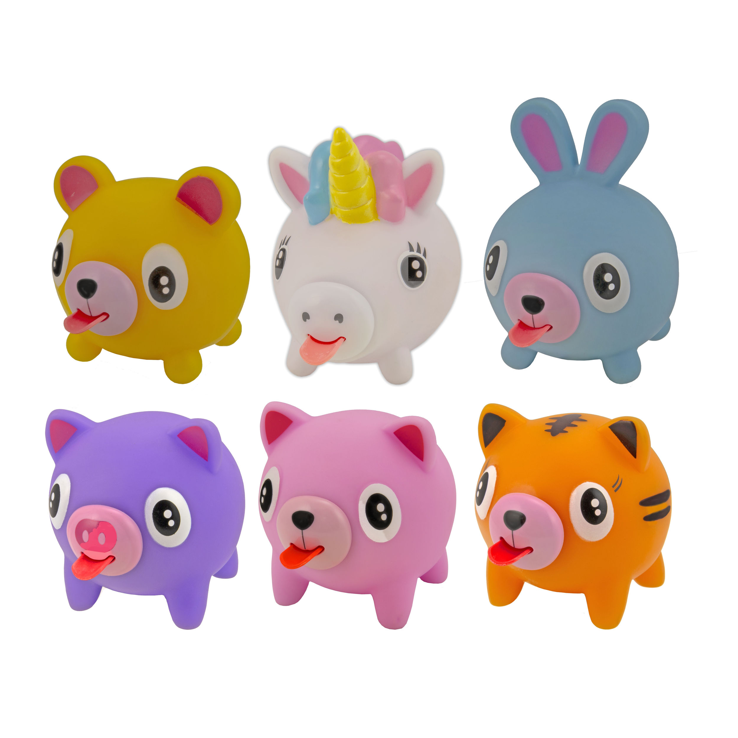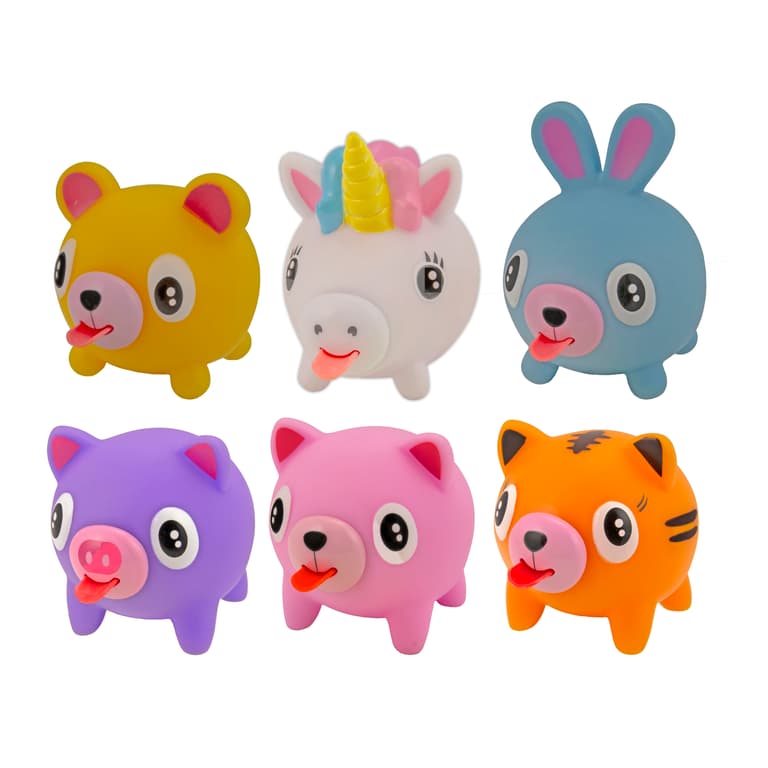 HIGH-QUALITY MATERIAL: ENVIRONMENTALLY FRIENDLY PVC material is used, the material is smooth, and the hand feels comfortable Shatter-resistant. Many Styles and Colors Long-eared Rabbit, Pink Pig, Purple Pig, Unicorn, Yellow Bear, Tiger,4x4x4 Inch; These cutesy critter fidget squeeze toys are perfect a perfect gift for kids, teens, and even adults! Just the slightest squeeze will send this ticklish giggler squeaking and keep you smiling all day long as it sticks its cute little red tongue out and squeals with joy.; WHEN SQUEEZING, THE ANIMAL WILL MAKE A "BB" & SPIT OUT A SMALL TONGUE to attract children's attention. If you release it without squeezing, the tongue will shrink again go in.