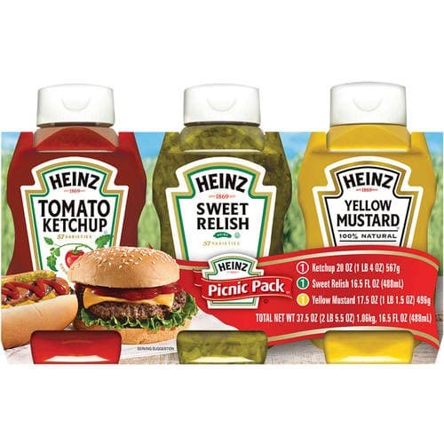 Heinz Ketchup, Sweet Relish & Yellow Mustard Picnic Pack is the thick & rich ketchup, sweet relish and tangy yellow mustard you love in a convenient variety pack. Use this 54 ounce condiment variety pack to create the perfect hot dog or hamburger. Heinz Ketchup, Sweet Relish & Yellow Mustard are packed in easy squeeze bottles with flip caps for clean and easy serving, making them the perfect bottled condiments for family picnics, barbecues, and camping trips. This picnic pack includes one 20 ounce bottle of tomato ketchup, one 16.5 fluid ounce bottle of sweet relish and one 17.5 ounce bottle of yellow mustard. Whatever the occasion, youll feel good serving your family Heinz Ketchup, Sweet Relish & Yellow Mustard.Specifications