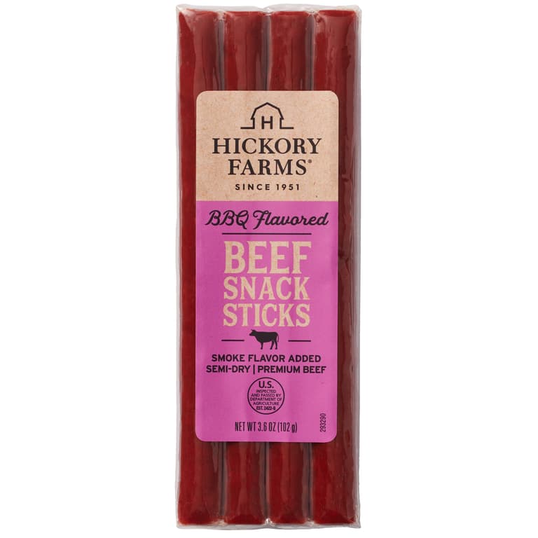 THESE BEEF SNACK STICKS ARE MADE WITH BOLD BARBECUE SPICES AND NATURAL SMOKE FLAVOR. THEY ARE GREAT FOR CAMPING, HIKING, OR ANY TIME YOU NEED A FLAVOR-PACKED SNACK ON THE GO. TRY THESE DIPPABLE STICKS WITH YOUR FAVORITE MUSTARD FOR A TASTY BITESpecifications
