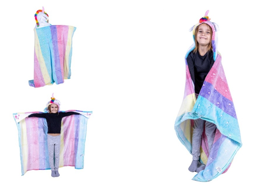 fun magical character with embroidery and additional details; hand pockets to wrap up all snuggly and warm; hooded cozy blanket; Soft plush blanket