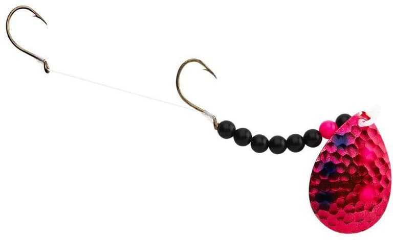 Pre snelled UV worm harness spinner with Quick Change clevis. Hand snelled with invisible Fluorocarbon leader and a #2 single hook. Hammered Colorado blade produces sonic vibration. Glo beads & UV blades attract fish in low light.Specifications