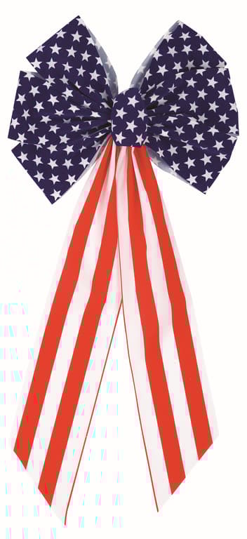 Fill your home with patriotism as you decorate for the Fourth of July! Stars & Stripes Velvet Bow is the perfect decoration to add to the inside or the outside of your space. It features seven loops with a knot in the middle. The loops are blue with white stars, and the ribbon tails below them are patterned with red and white stripes. Use the twist tie backing of this large bow to decorate chairs, banisters, and wreaths!Specifications