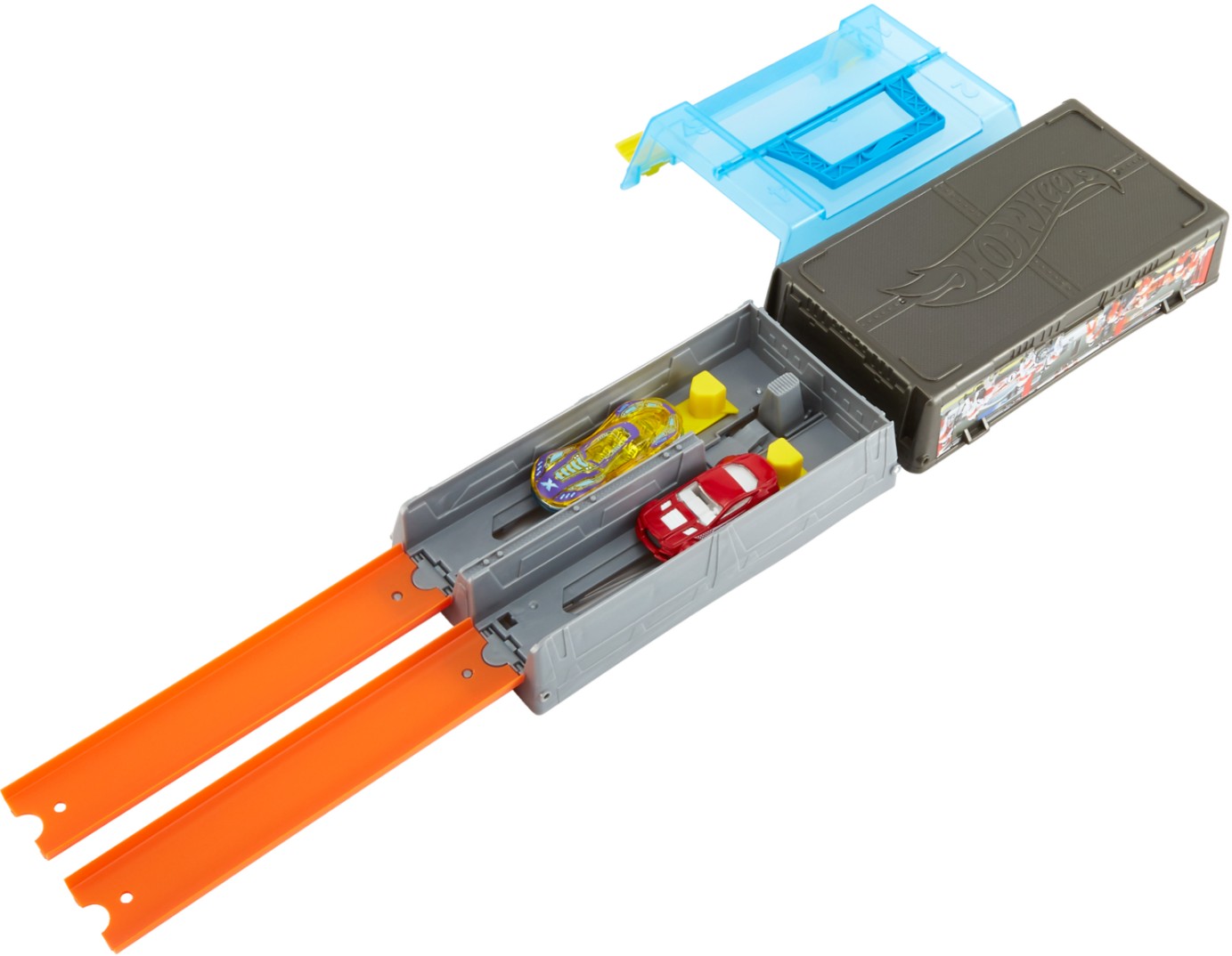 The convenient case holds the included cars, tracks and launchers but it can also hold a mini-collection of up to 10 more cars in total that are ready to race anywhere!; The Hot Wheels Race Case Track Set holds the basic elements for any Hot Wheels race: 2 launchers, 2 track pieces and 2 Hot Wheels cars.; The track pieces can be used with other Hot Wheels