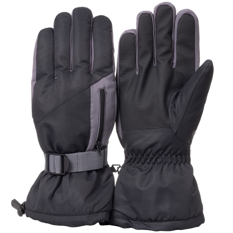 Get ready for a full day and night on the slopes with this black waterproof ski glove. Engineered with a gray and black Taslon shell backed by a waterproof membrane, it will keep you warm and dry. The butter-soft Long Pile fleece feels luxurious, and the PU palm patch gives you a perfect grip on the lift bar, the poles, or your drink with ease. Use the zipper pocket on the back to stash heat packs for added warmth, and the web belt to seal it all in.Specifications