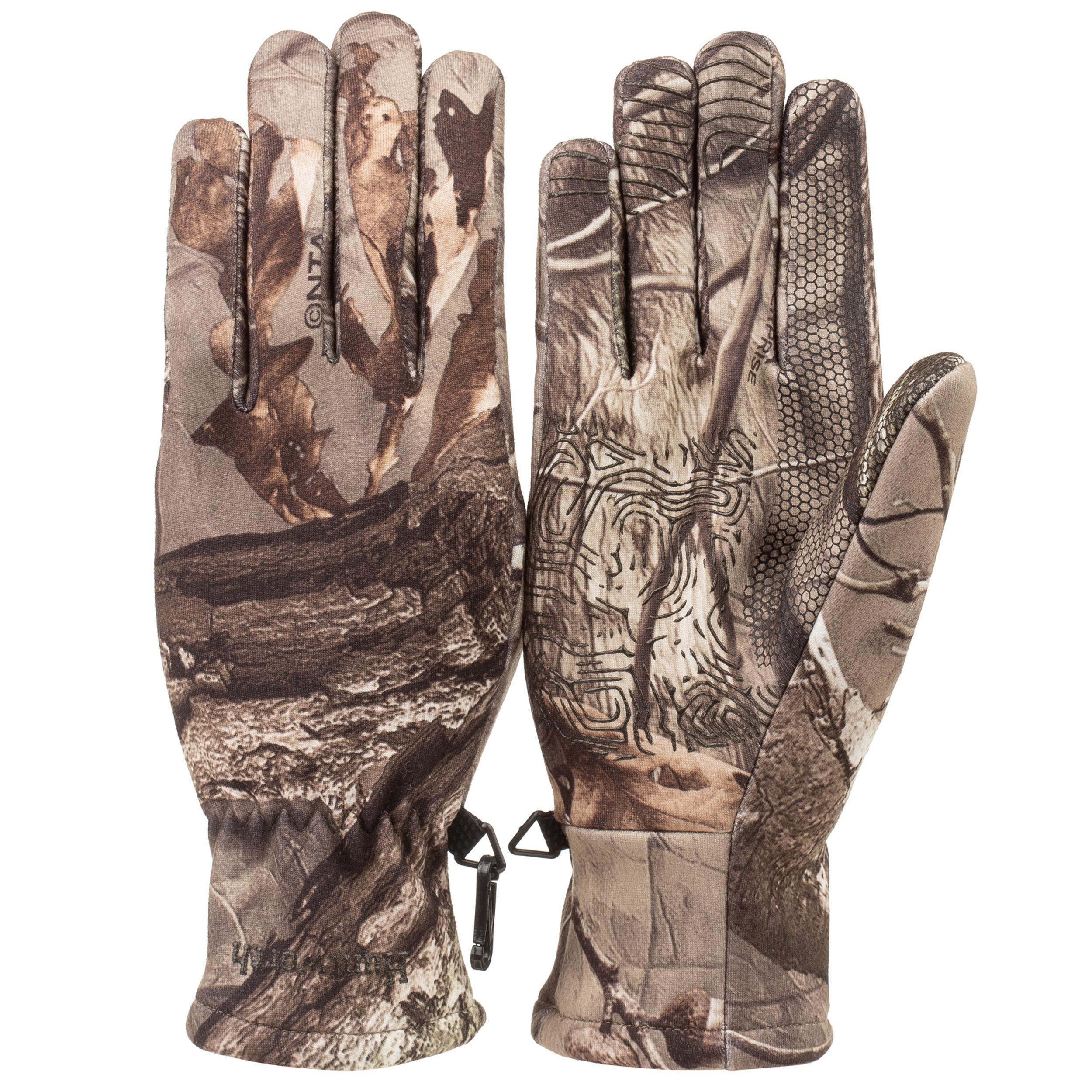 WHEN YOU NEED ABSOLUTE SILENCE, REACH FOR THESE HIDD’N CAMO GLOVES. CONSTRUCTED WITH A STRETCH POLYESTER BONDED TO A SOFT FLEECE FOR A COMFORTABLE NEXT TO SKIN FIT. THE DWR TREATMENT SHEDS LIGHT SNOW AND MOISTURE TO KEEP YOU DRY, AND THE MICROBAN ANTIMICROBIAL TREATMENT PROVIDES AMPLE SCENT REDUCTION. THERE’S A SILICON PRINT PALM THAT GIVES YOU EXCELLENT CONTROL OVER YOUR WEAPON, AND HELPS YOU ASCEND THE TREE STAND AND TEND TO CAMERAS. THE CONDUCTIVE INDEX FINGER AND THUMB ALSO LET YOU USE YOUR DEVICES WITH EASE. THIS GLOVE GETS THE JOB DONE.Specifications