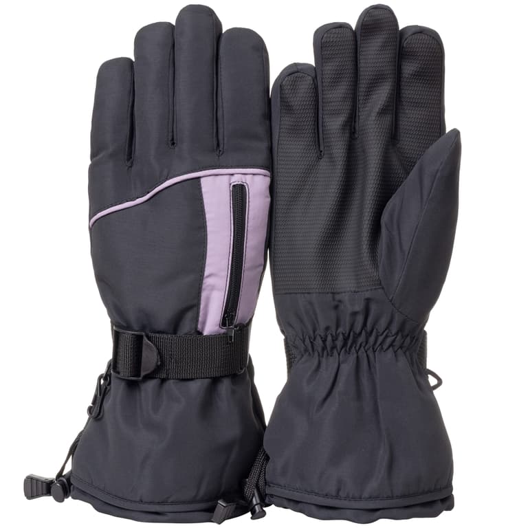 Get ready for the slopes with these classic waterproof ski gloves. Black with a touch of mauve, and a back of hand zip pocket for hand warmers, these gloves will keep out the cold. A luxurious Long Pile fleece lining adds comfort, and a PU palm patch gives you a grip on your poles. A long gauntlet with a cinched wrist and self-adjusting web belt keeps the snow and wind out. These are soon to be your favorite gloves for winter activities.Specifications