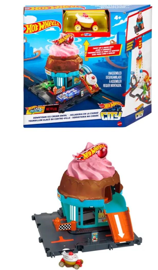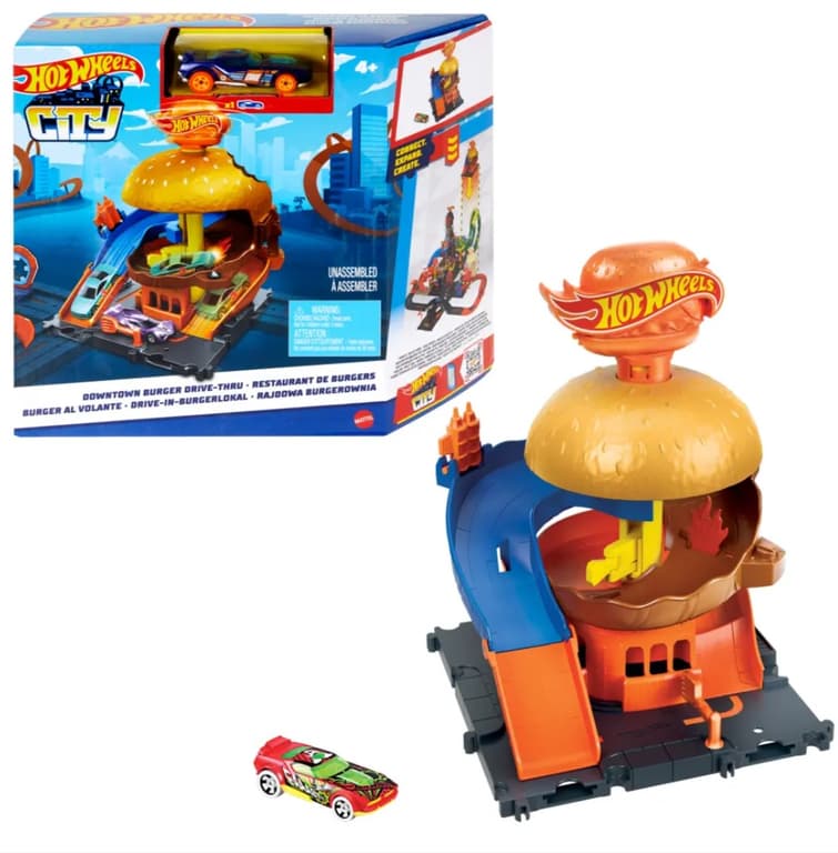 (we canot guarantee a specific style) If you would like us to choose for oyu we are happy to do so. If not, please visit us in store to choose your favorite style.The Hot Wheels City Downtown Assortment allows kids to create their own cityscape loaded with stunts and cool adventures. Each set plays into the Hot Wheels City nemesis theme, incorporating elements that a creature could be lurking nearby, just waiting to pounce. They all connect to other Hot Wheels sets through multiple connection points and each comes with one Hot Wheels vehicle for push-around play straight out of the box. With familiar locations such as a repair station, a burger drive-thru, a car wash and parking garage, kids will want to collect them all for endless storytelling possibilities. Each sold separately, subject to availability. Colors and decorations may vary.Specifications